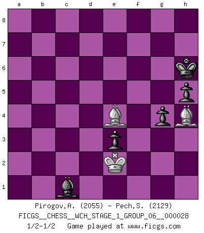 Last move : 1/2-1/2 2024 September 3 17:38:32 [Event "FICGS__CHESS__WCH_STAGE_1_GROUP_06__000028"] [Site "FICGS"] [Date "2024.03.26"] [Round "1"] [White "Pirogov,Andrey Mikhaylovich"] [Black "Pech,Stepan"] [Result "1/2-1/2"] [WhiteElo "2055"] [BlackElo "2129"] 1.e4 e6 2.d4 d5 3.Nc3 Nf6 4.e5 Nfd7 5.f4 c5 6.Nf3 Nc6 7.Be3 a6 8.Ne2 Qb6 9.Qc1 Be7 10.c3 O-O 11.h4 f6 12.h5 h6 13.Rh3 a5 14.Kf2 fxe5 15.fxe5 Ncxe5 16.dxe5 Nxe5 17.Kg1 Ng4 18.Rg3 e5 19.Nh2 Nxh2 20.Kxh2 Rf5 21.Kg1 Rxh5 22.Qd1 Qd6 23.b4 cxb4 24.cxb4 Be6 25.bxa5 Rf8 26.Qb1 Rhf5 27.Qb6 Qxb6 28.Bxb6 d4 29.Rf3 Rxf3 30.gxf3 Rxf3 31.Bg2 Ra3 32.Bxb7 Bc4 33.Nc1 d3 34.Rb1 d2 35.Nb3 Bg5 36.Rd1 Rxa2 37.Nxd2 Rxd2 38.Rxd2 Bxd2 39.a6 Bxa6 40.Bxa6 e4 41.Bc4+ Kh7 42.Kf1 h5 43.Ke2 Bc1 44.Bd5 e3 45.Bd8 Kh6 46.Bf7 g6 47.Bf6 g5 48.Be7 g4 49.Bh4 Bd2 50.Be8 Bc1 51.Bc6 Bd2 52.Be4 Bc1 53.Bc2 Bd2 54.Bb1 Bc1 55.Be4 Bd2 56.Bf5 Bc1 57.Be4 Bd2 58.Bf6 Bc1 59.Bh4 1/2-1/2 Follow this game move after move (download)Dazzling combinations are for the many, shifting wood is for the few. (Georg Kieninger) Im Blitz ist es einfacher mit einer Figur weniger anzugreifen, als sich mit einer Mehrfigur zu verteidigen. (Mikhail Nekhemyevich Tal) Un jugador que trata de regresar una movida en el Ajedrez es un futuro carterista. (Richard Fenton) Horreur, mais aussi harmonie suprême : qu'y avait-il en effet au monde en dehors des échecs ? Le brouillard, l'inconnu, le non-être... (Vladimir Nabokov) There's no money in correspondence chess. (John Knudsen)