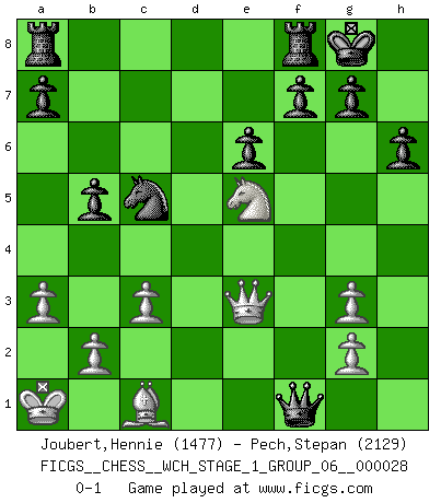 Last move : 0-1 2024 July 1 13:30:46 [Event "FICGS__CHESS__WCH_STAGE_1_GROUP_06__000028"] [Site "FICGS"] [Date "2024.03.26"] [Round "1"] [White "Joubert,Hennie"] [Black "Pech,Stepan"] [Result "0-1"] [WhiteElo "1477"] [BlackElo "2129"] 1.e4 c6 2.d4 d5 3.Nd2 dxe4 4.Nxe4 Bf5 5.Ng3 Bg6 6.Nf3 Nd7 7.h4 h6 8.h5 Bh7 9.Bd3 Bxd3 10.Qxd3 e6 11.Be3 Ngf6 12.O-O-O Bd6 13.c3 Qa5 14.Kb1 Bxg3 15.fxg3 O-O 16.Nd2 Qd5 17.Nf3 b5 18.a3 Ng4 19.Bc1 Nf2 20.Qe3 Nxd1 21.Rxd1 Qxh5 22.Rf1 c5 23.dxc5 Qf5+ 24.Ka1 Nxc5 25.Ne5 Qxf1 0-1 Follow this game move after move (download)The game of chess is the touchstone of the intellect. (Goethe) Wenn Spassky eine Figur opfert kannst du genauso gut aufgeben. Aber wenn Tal eine Figur opfert, spiel weiter. Er könnte noch eine weitere opfern, und dann ... wer weiß? (Miguel Najdorf) El Ajedrez hace al hombre ser mas sabio y ver mas claro. (Vladimir Putin) Tous ces prétendus hommes politiques sont les pions, les Cavaliers, les Tours ou les Fous d'une partie d'échecs qui se jouera tant qu'un hasard ne renversera pas l'échiquier. (Honoré de Balzac) No enterprise is more likely to succeed than one concealed from the enemy until it is ripe for execution. (Niccolo Machiavelli)