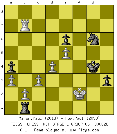 Last move : 0-1 2024 August 20 14:27:50 [Event "FICGS__CHESS__WCH_STAGE_1_GROUP_06__000028"] [Site "FICGS"] [Date "2024.03.26"] [Round "1"] [White "Maron,Paul"] [Black "Fox,Paul"] [Result "0-1"] [WhiteElo "2018"] [BlackElo "2099"] 1.d4 d5 2.Nf3 Nf6 3.e3 b6 4.Bd3 e6 5.O-O Bb7 6.Ne5 Bd6 7.f4 c5 8.c3 O-O 9.Nd2 Ne4 10.Nxe4 dxe4 11.Bc2 Qc8 12.Qh5 cxd4 13.exd4 f6 14.Bb3 fxe5 15.fxe5 Rxf1+ 16.Kxf1 Bf8 17.Qg4 Ba6+ 18.Kg1 Bc4 19.Bc2 Bd5 20.Bxe4 Bxe4 21.Qxe4 Nc6 22.Be3 Ne7 23.Rf1 b5 24.Bg5 Nd5 25.Qd3 Rb8 26.Bd2 Be7 27.Qf3 Qe8 28.Qg4 Bd8 29.Qe4 Rc8 30.Qe2 a5 31.a3 a4 32.Rf3 Rb8 33.Qd3 Qh5 34.h3 Be7 35.Bc1 g5 36.Kh2 Kh8 37.Qc2 Rg8 38.Qe2 g4 39.Rg3 Qh4 40.Qf1 gxh3 41.Rxh3 Qe4 42.Rf3 Qg6 43.Qf2 Bh4 44.g3 Bg5 45.Bxg5 Qxg5 46.Kh3 Ne7 47.Rf4 Nf5 48.g4 Qh6+ 49.Kg2 Ne7 50.Qg3 Nd5 51.Rf3 Qd2+ 52.Qf2 Qxf2+ 53.Kxf2 Rxg4 54.Rf8+ Kg7 55.Re8 Nf4 56.Rb8 h5 57.Rxb5 h4 58.Kf3 Rg1 59.Rb7+ Kg6 60.Rb8 Kf5 61.Rf8+ Kg5 62.Rg8+ Ng6 63.Kf2 Rb1 64.Rb8 Kg4 65.Rb7 h3 0-1 Follow this game move after move (download)My God, Bobby Fischer plays so simply. (Alexei Suetin) Die starken Figuren des Gegners muss man abtauschen. (José Raúl Capablanca) El Ajedrez demanda una total concentración. (Bobby Fischer) Les pièces de l'échiquier étaient impitoyables. Elles le retenaient, elles l'absorbaient. Il y avait de l'horreur en cela, mais aussi une harmonie unique. Car, qu'y a-t-il dans le monde, à part les échecs ? (V. Nabokov) The ultimate in disposing one's troops is to be without ascertainable shape. Then the most penetrating spies cannot pry in nor can the wise lay plans against you. (Sun Tzu)