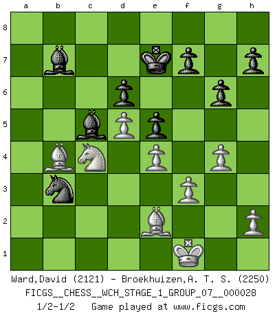 Last move : 1/2-1/2 2024 June 7 6:11:8 [Event "FICGS__CHESS__WCH_STAGE_1_GROUP_07__000028"] [Site "FICGS"] [Date "2024.03.26"] [Round "1"] [White "Ward,David"] [Black "Broekhuizen,A. T. S."] [Result "1/2-1/2"] [WhiteElo "2121"] [BlackElo "2250"] 1.e4 e5 2.Nf3 Nc6 3.Bb5 a6 4.Ba4 Nf6 5.O-O Be7 6.Re1 b5 7.Bb3 d6 8.a4 Bb7 9.d3 O-O 10.Nbd2 Nd7 11.c3 Nc5 12.axb5 axb5 13.Rxa8 Qxa8 14.Bc2 b4 15.d4 bxc3 16.bxc3 Nd7 17.Nf1 Bf6 18.d5 Ncb8 19.Be3 Na6 20.Qa1 Nac5 21.c4 Qxa1 22.Rxa1 Ra8 23.Rxa8+ Bxa8 24.N1d2 c6 25.Nb3 Na6 26.Na5 Ndb8 27.Nd2 Bd8 28.Ndb3 Kf8 29.Bd1 g6 30.f3 Ke7 31.Kf2 Nd7 32.Bd2 cxd5 33.cxd5 Nac5 34.g4 Bb6 35.Nxc5 Nxc5 36.Nc4 Ba7 37.Kf1 Bb7 38.Be2 Nb3 39.Bb4 Bc5 1/2-1/2 Follow this game move after move (download)Chess is thirty to forty percent psychology. You don't have this when you play a computer. I can't confuse it. (Judith Polgar) Ich hatte Angst gegen einen russischen Großmeister zu verlieren, und er befürchtete gegen einen kleinen Jungen zu verlieren. (über ein Remis gegen Juri Awerbach). (Robert James Fischer) Hasta este punto, las blancas han seguido un análisis bien conocido. Pero ahora el hace un error fatal: empieza a usar su propia cabeza. (Siegbert Tarrasch) Le pion, dans sa simplicité, marche droit devant lui, mais lorsqu'il prend, il le fait obliquement? Ainsi l'homme, tant qu'il reste pauvre, marche dans la droiture et vit honnêtement, mais lorsqu'il recherche les honneurs, il flatte, se parjure et, par les voies obliques, cherche une position supérieure sur l'échiquier du monde. (Jean de Galles) I teach you to lie, cheat and steal, and as soon as my back's turned you wait in line ? (Gregory House, House M.D.)