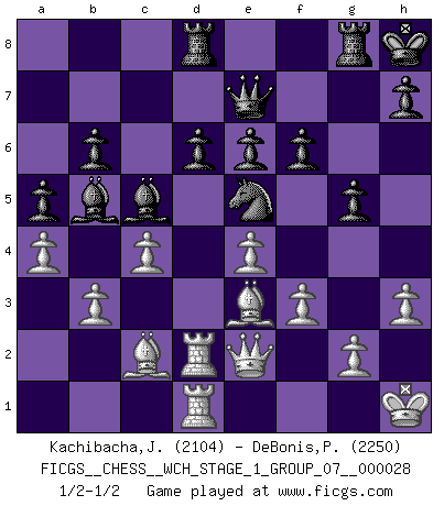 Last move : 1/2-1/2 2024 August 13 12:53:46 [Event "FICGS__CHESS__WCH_STAGE_1_GROUP_07__000028"] [Site "FICGS"] [Date "2024.03.26"] [Round "1"] [White "Kachibacha,Jobadi"] [Black "DeBonis,Patrick"] [Result "1/2-1/2"] [WhiteElo "2104"] [BlackElo "2250"] 1.e4 c5 2.Nf3 Nc6 3.Bb5 e6 4.O-O Nge7 5.Re1 b6 6.c3 a6 7.Ba4 c4 8.Bc2 Ng6 9.d4 cxd3 10.Qxd3 Qc7 11.a4 Bb7 12.Qe2 Bc5 13.Nbd2 O-O 14.Nb3 Bd6 15.Be3 Nce5 16.Nxe5 Nxe5 17.h3 Nc4 18.Bc1 Rfc8 19.Nd4 Be7 20.b3 Ne5 21.c4 Re8 22.Bf4 Bb4 23.Rf1 d6 24.Rad1 Bc5 25.Be3 Rad8 26.Rfe1 f6 27.Rb1 Kh8 28.Red1 a5 29.Rd2 Qe7 30.Rbd1 g5 31.f3 Rg8 32.Nb5 Bc6 33.Kh1 Bxb5 1/2-1/2 Follow this game move after move (download)I thought the most common mistake [in chess] was the first one: Learning the game :P (Garvin Gray, FICGS forum) Nach Morphy wurde nichts neues mehr in der Behandlung offener Positionen gefunden. (Mikhail Moiseyevich Botvinik) Me siento como si fuera una pieza en una partida de Ajedrez, cuando mi oponente me indica: esa pieza no puede ser movida. (Soren Kierkegaard) J'ai vu le vaincu d'Echecs jouer des années durant dans l'espoir de la fête de la victoire. Car tu es plus riche de ce qu'elle existe si même elle n'est point pour toi. Ainsi de la perle du fond des mers. (Antoine de Saint-Exupéry) Hardware: the parts of a computer that can be kicked. (Jeff Persis)