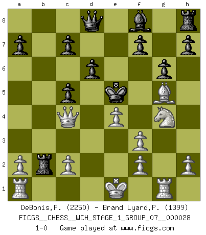 Last move : 1-0 2024 May 14 0:5:44 [Event "FICGS__CHESS__WCH_STAGE_1_GROUP_07__000028"] [Site "FICGS"] [Date "2024.03.26"] [Round "1"] [White "DeBonis,Patrick"] [Black "Brand Lyard,Paul"] [Result "1-0"] [WhiteElo "2250"] [BlackElo "1399"] 1.e4 e5 2.Nf3 Nc6 3.Bb5 d6 4.Nc3 Bg4 5.d4 exd4 6.Qxd4 Bxf3 7.Bxc6+ bxc6 8.gxf3 c5 9.Qc4 Nf6 10.Rg1 g6 11.Bg5 Rb8 12.Qa4+ Ke7 13.Nd5+ Ke6 14.Qc4 Rxb2 15.Nxf6 Ke5 16.Ng4+ 1-0 Follow this game move after move (download)You can only get good at Chess if you love the game. (Bobby Fischer) Schach ist eine Sache der genauen Beurteilung, wann man zuschlagen und wann man sich ducken muss. (Robert James Fischer) El Ajedrez demanda una total concentración. (Bobby Fischer) Les échecs sont un jeu terrible. Si vous n'avez pas le centre, votre adversaire a une position plus libre. Par contre, si vous avez le centre, alors vous avez vraiment quelque chose pour laquelle vous inquiéter ! (Siegbert Tarrasch) Every vice is only an exaggeration of a necessary and virtuous function. (Ralph Waldo Emerson, Journals 1936)
