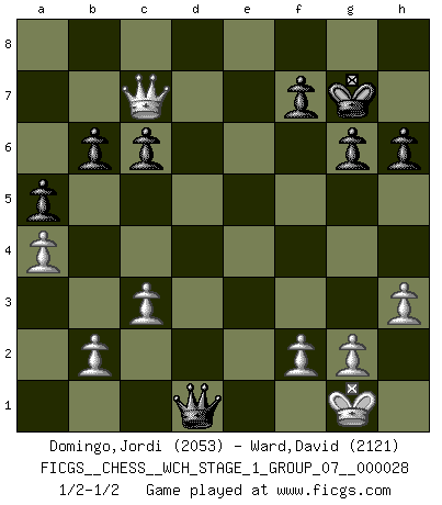 Last move : 1/2-1/2 2024 May 4 21:53:17 [Event "FICGS__CHESS__WCH_STAGE_1_GROUP_07__000028"] [Site "FICGS"] [Date "2024.03.26"] [Round "1"] [White "Domingo,Jordi"] [Black "Ward,David"] [Result "1/2-1/2"] [WhiteElo "2053"] [BlackElo "2121"] 1.e4 e5 2.Nf3 Nc6 3.Bc4 Bc5 4.c3 Nf6 5.d3 d6 6.Bb3 O-O 7.Nbd2 a5 8.O-O Be6 9.a4 h6 10.Nc4 Re8 11.Re1 Qd7 12.h3 Rad8 13.Be3 Bxe3 14.Nxe3 d5 15.exd5 Nxd5 16.Nxd5 Bxd5 17.Re3 Re6 18.Bxd5 Qxd5 19.Qc2 b6 20.Rae1 Rde8 21.R1e2 Nb8 22.d4 exd4 23.Rxe6 Rxe6 24.Nxd4 Rxe2 25.Qxe2 Kh7 26.Qd3+ g6 27.Qe3 Kg7 28.Qf4 Na6 29.Nb5 c6 30.Nc7 Nxc7 31.Qxc7 Qd1+ 1/2-1/2 Follow this game move after move (download)Bobby Fischer's current state of mind is indeed a tragedy. One of the world's greatest Chess players - the pride and sorrow of American Chess. (Frank Brady) Man gibt nur Pakete auf. (Paul Keres) Durante una competencia de Ajedrez, un Maestro de Ajedrez deberá ser una combinación de presa de caza y un Monge. (Alexander Alekhine) Mon pion favori sur ma case favorite ! Bronstein en parlant d'un coup de pion en h5 quand il avait les Noirs. When I took office, only high energy physicists had ever heard of what is called the World Wide Web... Now even my cat has its own page. (Bill Clinton, 1996)