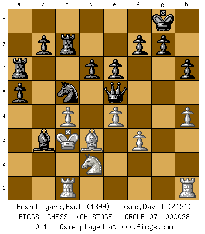 Last move : 0-1 2024 April 16 8:51:28 [Event "FICGS__CHESS__WCH_STAGE_1_GROUP_07__000028"] [Site "FICGS"] [Date "2024.03.26"] [Round "1"] [White "Brand Lyard,Paul"] [Black "Ward,David"] [Result "0-1"] [WhiteElo "1399"] [BlackElo "2121"] 1.d4 Nf6 2.c4 e6 3.Bg5 h6 4.Bxf6 Qxf6 5.Nf3 Bb4+ 6.Nfd2 c5 7.Qb3 Bxd2+ 8.Nxd2 cxd4 9.e4 d6 10.Qb5+ Nd7 11.Rc1 O-O 12.h4 a5 13.a4 Nc5 14.f3 Bd7 15.Qb6 Ra6 16.Qc7 Qf4 17.Be2 Rc8 18.g3 Qxg3+ 19.Kd1 Rxc7 20.Kc2 Bxa4+ 21.b3 d3+ 22.Bxd3 Bxb3+ 23.Kc3 Qe5+ 0-1 Follow this game move after move (download)If Chess is a science, it's a most inexact one. If Chess is an art, it is too exacting to be seen as one. If Chess is a sport, it's too esoteric. If Chess is a game, it's too demanding to be just a game. If Chess is a mistress, she's a demanding one. If Chess is a passion, it's a rewarding one. If Chess is life, it's a sad one. (Unknown) Der Vorposten provoziert a) eine Basis für neue Angriffe und b) eine Schwächung der gegnerischen Widerstandskraft in der fraglichen Linie. (Aaron Nimzowitsch) El Ajedrez es parte de la cultura, y si una cultura esta en decadencia, entonces también el Ajedrez declinará. (Mikhail Botvinnik) Une platitude souvent récitée à propos des Echecs est qu'une des choses les plus difficiles à réaliser est de gagner une position gagnante. Cela ne manque pas de sens mais, pour ma part, j'ai toujours trouvé plus difficile de gagner une position perdante. (Tim Krabbe) Go and wake up your luck. (Persian saying)