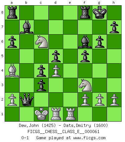Last move : 0-1 2007 October 13 18:51:59 [Event "FICGS__CHESS__CLASS_E__000061"] [Site "FICGS"] [Date "2007.09.14"] [Round "1"] [White "Dew,John"] [Black "Dats,Dmitry"] [Result "0-1"] [WhiteElo "1425"] [BlackElo "1600"] 1.e4 e6 2.Bb5 a6 3.Ba4 b5 4.Bb3 Bb7 5.d3 f5 6.Nf3 Nf6 7.Bg5 Be7 8.exf5 exf5 9.Ne5 d5 10.Bxf6 Bxf6 11.Qe2 Qe7 12.d4 c5 13.c3 c4 14.Bc2 g6 15.Nd2 O-O 16.O-O-O Nc6 17.Ndf3 b4 18.Ba4 bxc3 19.Nxc6 Qxe2 20.Rhe1 Qxb2+ 0-1 French defense Kingside Castling by player Black (move 15) Queenside Castling by player White (move 16) Player Black won this chess game. Follow this game move after move (download)The laws of Chess do not permit a free choice: you have to move whether you like it or not. (Emanuel Lasker) Taktik ist was man tun muß, wenn etwas zu tun ist. Strategie ist was man tun muß, wenn nichts zu tun ist. (Savielly Grigorievitsch Tartakower) El hombre es un frívolo, una creatura engañosa y como un jugador de Ajedrez, se preocupa mas por el proceso de obtener su meta que de la meta por sí misma. (Dostoyevsky) Les Echecs, c'est l'art de la guerre sans les charniers, c'est la résurrection des morts tombés au champ d'honneur, l'espoir perpétuel, la suprématie de l'intelligence sur la force, la culture de l'esprit. (F. Szpiner) The real voyage of discovery consists not in seeking new lands but in seeing with new eyes. (Marcel Proust)