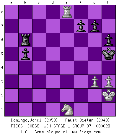 Last move : 1-0 2024 June 16 9:12:59 [Event "FICGS__CHESS__WCH_STAGE_1_GROUP_07__000028"] [Site "FICGS"] [Date "2024.03.26"] [Round "1"] [White "Domingo,Jordi"] [Black "Faust,Dieter"] [Result "1-0"] [WhiteElo "2053"] [BlackElo "2048"] 1.e4 e5 2.Nf3 Nc6 3.Bc4 Bc5 4.c3 Nf6 5.d3 d6 6.Bb3 h6 7.O-O O-O 8.h3 Re8 9.Re1 a6 10.a4 Ba7 11.Nbd2 Be6 12.Bxe6 Rxe6 13.b4 d5 14.Qc2 d4 15.Bb2 dxc3 16.Bxc3 b5 17.Nb3 Bb6 18.Red1 Qe8 19.axb5 axb5 20.Na5 Nxa5 21.bxa5 Bc5 22.Bxe5 Rxe5 23.d4 Bxd4 24.Rxd4 Re7 25.e5 Nd7 26.e6 Rxe6 27.Qxc7 Nf6 28.Rad1 Re7 29.Qb6 Re6 30.Rd6 Rxd6 31.Rxd6 Ne4 32.Rd5 Nc3 33.Re5 Qd7 34.a6 Kh7 35.g3 Ra7 36.Re8 Rxa6 37.Qb8 Qd5 38.Rh8+ Kg6 39.Nh4+ Kh5 40.Kh2 Ne2 41.Qe8 Nxg3 42.Ng2 Rf6 43.Qe1 Qe4 44.fxg3 Qxe1 45.Nxe1 Rb6 46.Re8 1-0 Follow this game move after move (download)Any material change in a position must come about by mate, a capture, or a Pawn promotion. (Purdy) Wenn ich einen Club besuche, sind die Spieler stumm vor Staunen. (José Raúl Capablanca) Cuando tu no sabes absolutamente que mas hacer, es tiempo de entrar en pánico. (John van der Wiel) D'abord les bases : Jouez et étudiez, puis étudiez et jouez, ensuite jouez et étudiez, puis étudiez et jouez. Deuxièmement : Donnez toujours le meilleur de vous-même ! (Ken Smith) To err is human, to shift the blame on someone else is tactical. (Mladen Jankovic)