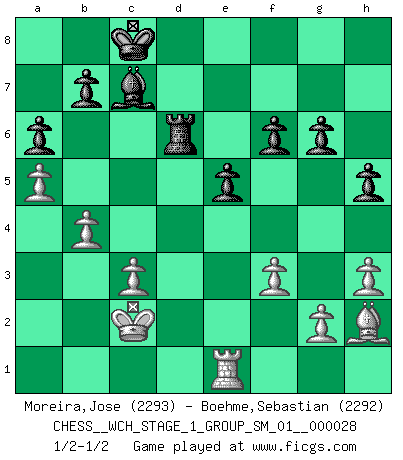 Last move : 1/2-1/2 2024 April 14 22:13:13 [Event "FICGS__CHESS__WCH_STAGE_1_GROUP_SM_01__000028"] [Site "FICGS"] [Date "2024.03.26"] [Round "1"] [White "Moreira,Jose"] [Black "Boehme,Sebastian"] [Result "1/2-1/2"] [WhiteElo "2293"] [BlackElo "2292"] 1.e4 c5 2.Nf3 d6 3.d4 cxd4 4.Nxd4 Nf6 5.Nc3 a6 6.f3 e5 7.Nb3 Be6 8.Be3 h5 9.Qd2 Nbd7 10.Nd5 Bxd5 11.exd5 g6 12.O-O-O Nb6 13.Kb1 Nbxd5 14.Bg5 Be7 15.Bd3 Qc7 16.Rhe1 Nb6 17.a4 O-O-O 18.a5 Nbd7 19.Be3 Kb8 20.Bg1 d5 21.h3 Rhe8 22.c3 Nc5 23.Bc2 Nxb3 24.Bxb3 Bc5 25.Bh2 Bd6 26.Qg5 Re6 27.Bxd5 Nxd5 28.Rxd5 Be7 29.Qd2 f6 30.Rxd8+ Qxd8 31.Qxd8+ Bxd8 32.b4 Kc8 33.Kc2 Bc7 34.Rd1 Rd6 35.Re1 Re6 36.Rd1 Rd6 37.Re1 1/2-1/2 Follow this game move after move (download)It is peculiar but a fact nevertheless, that gamblers in chess always have enthusiastic followers. (Botvinnik) Die FIDE ist dabei in die Hände der russischen Mafia zu fallen. (Larry Evans) A través de las casillas del tablero, los Indios explican el movimiento del tiempo y la edad, las influencias mas altas que controlan el mundo y los lazos que vinculan al Ajedrez con el alma humana. (Al-Masudi) Les ravages du H expliquent la différence de niveau entre Tal et Thal [Abergel]. Art is the only way to run away without leaving home. (Twyla Tharp)