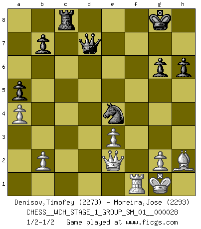 Last move : 1/2-1/2 2024 May 31 4:21:34 [Event "FICGS__CHESS__WCH_STAGE_1_GROUP_SM_01__000028"] [Site "FICGS"] [Date "2024.03.26"] [Round "1"] [White "Denisov,Timofey"] [Black "Moreira,Jose"] [Result "1/2-1/2"] [WhiteElo "2273"] [BlackElo "2293"] 1.e4 e5 2.Nf3 Nc6 3.Bc4 Nf6 4.d3 Bc5 5.c3 a5 6.O-O d6 7.Bg5 h6 8.Bh4 Ba7 9.Na3 Bg4 10.h3 Bh5 11.Re1 g5 12.Bg3 O-O 13.Nc2 Re8 14.Ne3 Bxe3 15.fxe3 Nb8 16.a4 Nbd7 17.Qc2 c6 18.Re2 d5 19.exd5 cxd5 20.Bb5 e4 21.dxe4 Nxe4 22.Bh2 Re6 23.c4 Rc8 24.Qd1 g4 25.hxg4 Bxg4 26.cxd5 Rg6 27.Bxd7 Qxd7 28.Ne5 Bxe2 29.Qxe2 Qxd5 30.Nxg6 fxg6 31.Rd1 Qf5 32.Rf1 Qd7 1/2-1/2 Follow this game move after move (download)What is the object of playing a gambit opening?... To acquire a reputation of being a dashing player at the cost of losing a game. (Siegbert Tarrasch) Die Arbeit ist etwas Unnatürliches. Die Faulheit allein ist göttlich. (Anatole France) En la vida, como en el Ajedrez, los Peones propios obstruyen nuestro camino. La gran fortuna de un hombre, su comodidad, placer, hijos, libros, que deberían ayudarle a ganar, con mucha frecuencia lo ponen en Jaque Mate. (Charles Buxton) Dieu déplace le joueur, et celui-ci la pièce. Quel Dieu derrière Dieu commence donc la trame ? Arturo Perez-Reverte (prix de littérature policière 1993). Ah, beer! The cause of, and the solution to, all of life's problems. (Homer Simpson)