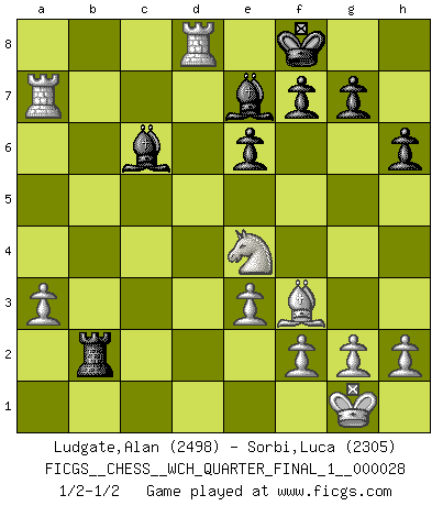 Last move : 1/2-1/2 2024 April 9 11:38:4 [Event "FICGS__CHESS__WCH_QUARTER_FINAL_1__000028"] [Site "FICGS"] [Date "2024.03.26"] [Round "1"] [White "Ludgate,Alan"] [Black "Sorbi,Luca"] [Result "1/2-1/2"] [WhiteElo "2498"] [BlackElo "2305"] 1.d4 Nf6 2.c4 e6 3.Nf3 d5 4.Nc3 Bb4 5.Bg5 h6 6.Bxf6 Qxf6 7.e3 O-O 8.Rc1 dxc4 9.Bxc4 c5 10.O-O cxd4 11.Ne4 Qe7 12.Nxd4 Bd7 13.Be2 Nc6 14.a3 Nxd4 15.Qxd4 Ba5 16.Qc5 Bd8 17.Qxe7 Bxe7 18.Rc7 Rfd8 19.Rxb7 Rab8 20.Rxa7 Rxb2 21.Bf3 Kf8 22.Rd1 Bc6 23.Rxd8+ 1/2-1/2 Follow this game move after move (download)Even the laziest King flees wildly in the face of a double check ! (Aaron Nimzowitsch) Im Hotelzimmer gab es nur zwei Schaben. (Über die Turnierbedingungen) (Peter Swidler) Durante una competencia de Ajedrez, un Maestro de Ajedrez deberá ser una combinación de presa de caza y un Monge. (Alexander Alekhine) Les sacrifices démontrent seulement que quelqu'un a gaffé. (Savielly Tartacover) The human is the only animal species whose members are able to talk themselves into difficulties that would not otherwise exist. (Wendell Johnson)