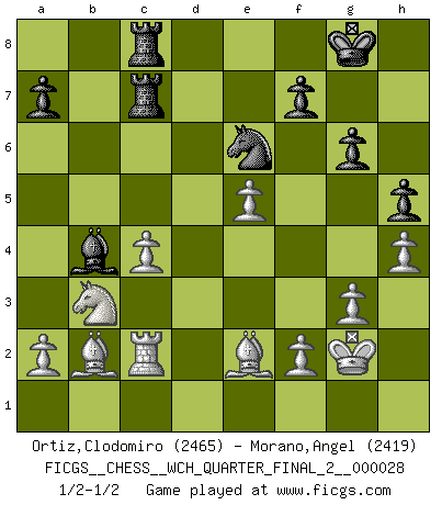 Last move : 1/2-1/2 2024 May 20 19:46:50 [Event "FICGS__CHESS__WCH_QUARTER_FINAL_2__000028"] [Site "FICGS"] [Date "2024.03.26"] [Round "1"] [White "Ortiz,Clodomiro"] [Black "Morano,Angel"] [Result "1/2-1/2"] [WhiteElo "2465"] [BlackElo "2419"] 1.d4 Nf6 2.c4 e6 3.Nf3 b6 4.g3 Ba6 5.b3 Bb4+ 6.Bd2 Be7 7.Bg2 c6 8.O-O d5 9.Bc3 Nbd7 10.Nbd2 O-O 11.Qc2 c5 12.dxc5 bxc5 13.Rfe1 Rc8 14.Rac1 Re8 15.Bb2 Bb7 16.cxd5 exd5 17.e4 c4 18.e5 Ne4 19.bxc4 Bc5 20.Nxe4 dxe4 21.Rxe4 Bxe4 22.Qxe4 Nf8 23.h4 Ne6 24.Bh3 Qb6 25.Rc2 Qc6 26.Nd2 Bb4 27.Qxc6 Rxc6 28.Nb3 Rec8 29.Bf1 g6 30.Kg2 h5 31.Be2 R6c7 32.Nd2 Nc5 33.Nb3 Ne6 34.Nd2 Nc5 35.Nb3 Ne6 1/2-1/2 Follow this game move after move (download)There must have been a time when men were demigods, or they could not have invented Chess. (Gustav Schenk) Es genügt nicht ein guter Spieler zu sein, man muß auch gut spielen. (Siegbert Tarrasch) El Ajedrez es un invernadero donde los frutos del carácter pueden madurar mas completamente que en la vida. (Edward Morgan Foster) Echiquier : carré parfait, comme la Jérusalem nouvelle décrite par l'auteur de l'Apocalypse, huit cases sur huit, exaltation du chiffre 4, symbole du cosmos aux quatre horizons... où le noir et le blanc, l'ombre et la lumière, le mal et le bien s'entremêlent et se conjuguent. (Robert Couffignal, Le Gambit du poète) God is an atheist. (Unknown)