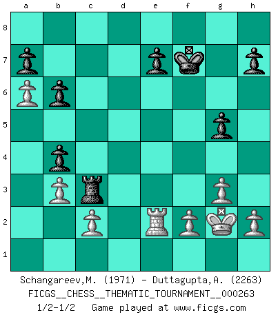 Last move : 1/2-1/2 2024 June 4 0:41:33 [Event "FICGS__CHESS__THEMATIC_TOURNAMENT__000263"] [Site "FICGS"] [Date "2024.03.28"] [Round "1"] [White "Schangareev,Mirzian"] [Black "Duttagupta,Aniruddha"] [Result "1/2-1/2"] [WhiteElo "1971"] [BlackElo "2263"] 1.e4 d5 2.exd5 Qxd5 3.Nc3 Qd6 4.Nf3 Nf6 5.d4 c6 6.Ne5 Nbd7 7.Nc4 Qc7 8.a4 g6 9.a5 Bg7 10.g3 O-O 11.Bg2 Nd5 12.O-O N7f6 13.Nxd5 Nxd5 14.Re1 Be6 15.Ne5 Rad8 16.Qe2 Bxe5 17.Qxe5 Qxe5 18.Rxe5 Nb4 19.Re2 Rxd4 20.Be3 Bc4 21.R2e1 Rd7 22.Rec1 b6 23.Bh3 Rb7 24.a6 R7b8 25.b3 Be6 26.Bxe6 fxe6 27.Bd2 c5 28.Bxb4 cxb4 29.Re1 Rbc8 30.Re2 Rc6 31.Rd1 Rfc8 32.Rd7 R6c7 33.Rxc7 Rxc7 34.Rxe6 Kf7 35.Re2 g5 36.Kg2 Rc3 1/2-1/2 Follow this game move after move (download)Chess is a sea in which a gnat may drink and an elephant may bathe. (Hindu proverb) Das Spiel gibt uns die Genugtuung, die das Leben uns versagt. (Emanuel Lasker) Por esta medida (el intervalo entre Fischer y sus contemporaneos), yo le considero el mas grande campeón mundial. (Garry Kasparov) L'ordinateur a tué l'originalité. Il n'y a plus guère d'aventures sur l'échiquier. (Jacob Murray) Pretend inferiority and encourage his arrogance. (Sun Tzu)