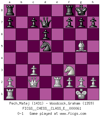 Last move : 0-1 2008 February 17 22:30:56 [Event "FICGS__CHESS__CLASS_E__000061"] [Site "FICGS"] [Date "2007.09.14"] [Round "1"] [White "Pech,Matej"] [Black "Woodcock,Graham"] [Result "0-1"] [WhiteElo "1431"] [BlackElo "1359"] 1.c4 e5 2.Nc3 Bc5 3.e3 Nf6 4.Nf3 d6 5.d4 exd4 6.exd4 Bb4 7.Qa4+ Nc6 8.d5 Bxc3+ 9.bxc3 Qe7+ 10.Be2 Bd7 11.dxc6 Bxc6 12.Qc2 b5 13.cxb5 Bxb5 14.O-O Bxe2 15.Re1 O-O 16.Rxe2 Qd7 17.Bg5 Nd5 0-1 This chess game has been lost on time (started : 2007.09.14 14:48:59) English Opening Kingside Castling by player White (move 14) Kingside Castling by player Black (move 15) Player Black won this chess game. Follow this game move after move (download)When asked, -How is that you pick better moves than your opponents?, I responded: I'm very glad you asked me that, because, as it happens, there is a very simple answer. I think up my own moves, and I make my opponent think up his. (Alexander Alekhine) Wenn Dein Gegner dir ein Remis anbietet, versuch herauszufinden, weshalb er glaubt schlechter zu stehen. (Nigel Short) El Ajedrez es el arte del análisis. (Mikhail Botvinnik) Le joueur d'Echecs qui veut atteindre le top est obligé de développer son propre credo créatif. Alexeï Stepanovicth Souétine. Il est facile d'écrire des livres ! Ce qui est difficile, c'est de jouer ! (Alexeï Stepanovicth Souétine) In fact if nothing is done against this teddy bear, hereby I announce that I would quit chess, rapid chess, blitz chess, postal chess, email chess, server chess and correspondence chess I will then switch to a table game where teddy bears aren't going to be seen for a while, like Poker, or Roulette, all 18+ games. (Elmer Valderrama)