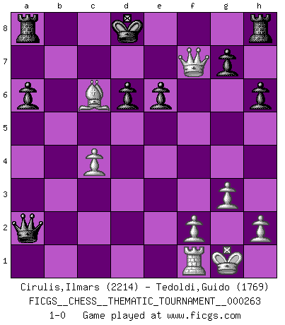 Last move : 1-0 2024 June 16 15:47:0 [Event "FICGS__CHESS__THEMATIC_TOURNAMENT__000263"] [Site "FICGS"] [Date "2024.03.28"] [Round "1"] [White "Cirulis,Ilmars"] [Black "Tedoldi,Guido"] [Result "1-0"] [WhiteElo "2214"] [BlackElo "1769"] 1.e4 d5 2.exd5 Qxd5 3.Nc3 Qd6 4.d4 a6 5.g3 e6 6.Ne4 Qd8 7.Bg2 Nf6 8.Nxf6+ Qxf6 9.Nf3 h6 10.O-O Nc6 11.c4 Bd7 12.d5 Ne5 13.Nxe5 Qxe5 14.Bf4 Qxb2 15.Rb1 Qxa2 16.Rxb7 Bd6 17.Bxd6 cxd6 18.dxe6 fxe6 19.Qh5+ Ke7 20.Rxd7+ Kxd7 21.Qf7+ Kd8 22.Bc6 1-0 Follow this game move after move (download)It is always better to sacrifice your opponent's men. (Savielly Tartakower) Ich war zu klein für die Schach-Schülermannschaft! (Woody Allen) Haz el enroque temprano y seguido. (Rob Sillars) Votre prénom est 'Tactique', votre deuxième prénom est 'Tactique' et votre nom est 'Tactique'. (Ken Smith) Ah, the Socrating method. The best way we have of teaching everything-apart from juggling chainsaws. (Gregory House, House M.D.)