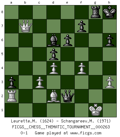 Last move : 0-1 2024 April 7 22:2:6 [Event "FICGS__CHESS__THEMATIC_TOURNAMENT__000263"] [Site "FICGS"] [Date "2024.03.28"] [Round "1"] [White "Leurette,Marc-Antoine"] [Black "Schangareev,Mirzian"] [Result "0-1"] [WhiteElo "1624"] [BlackElo "1971"] 1.e4 d5 2.exd5 Qxd5 3.Nc3 Qd6 4.d4 Nf6 5.Nf3 c6 6.Be2 Bg4 7.O-O Nbd7 8.Be3 e6 9.h3 Bh5 10.a3 Be7 11.b4 O-O 12.Qd3 a5 13.b5 Nd5 14.bxc6 bxc6 15.Nxd5 cxd5 16.Qd2 Bxf3 17.Bxf3 Rfc8 18.a4 Nb6 19.Be2 Nc4 20.Bxc4 Rxc4 21.c3 Qc6 22.Rfc1 Rxa4 23.Qc2 Rxa1 24.Rxa1 a4 25.Bd2 a3 26.f4 Qc4 27.g4 Qe2 28.g5 Bd6 29.Ra2 h5 30.gxh6 gxh6 31.Qb3 Kh8 32.Qb7 Rg8+ 0-1 Follow this game move after move (download)After a bad opening, there is hope for the middle game. After a bad middle game, there is hope for the endgame. But once you are in the endgame, the moment of truth has arrived. (Edmar Mednis) Die westlichen Werte sind eine Sprache, welche die Putin-Administration nicht versteht. (Garry Kasparov) Sin errores no puede haber brillantez. (Emanuel Lasker) Mais n'est-ce pas déjà le limiter injurieusement que d'appeler les échecs un jeu? N'est-ce pas aussi une science, un art, ou quelque chose qui, comme le cercueil de Mahomet entre ciel et terre, est suspendu entre l'un et l'autre, et qui réunit un nombre incroyable de contraires ? (Stefan Zweig) The bottom line is always the bottom line. (Johann Piek)