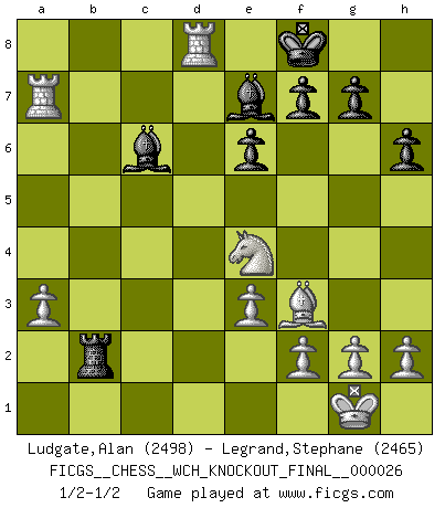 Last move : 1/2-1/2 2024 June 2 9:24:10 [Event "FICGS__CHESS__WCH_KNOCKOUT_FINAL__000026"] [Site "FICGS"] [Date "2024.03.29"] [Round "1"] [White "Ludgate,Alan"] [Black "Legrand,Stephane"] [Result "1/2-1/2"] [WhiteElo "2498"] [BlackElo "2465"] 1.d4 Nf6 2.c4 e6 3.Nf3 d5 4.Nc3 Bb4 5.Bg5 h6 6.Bxf6 Qxf6 7.e3 O-O 8.Rc1 dxc4 9.Bxc4 c5 10.O-O cxd4 11.Ne4 Qe7 12.Nxd4 Bd7 13.Be2 Nc6 14.a3 Nxd4 15.Qxd4 Ba5 16.Qc5 Bd8 17.Qxe7 Bxe7 18.Rc7 Rfd8 19.Rxb7 Rab8 20.Rxa7 Rxb2 21.Bf3 Kf8 22.Rd1 Bc6 23.Rxd8+ 1/2-1/2 Follow this game move after move (download)Chess is above all, a fight ! (Emanuel Lasker) Ich suche im Schach immer etwas Eigenes. Riskantes Spiel im Stile schachlicher Musketiere ist nicht meine Sache, auch wenn es vielen Freunden scharfer Wendungen gefällt. (Anatoly Karpov) Buenas posiciones no logran ganar juegos, buenas movidas sí. (Gerald Abrahams) Donnez-moi un Cavalier en 6e et je gagnerais toutes mes parties. (Steinitz) I'll be back. (Arnold Schwarzenegger)