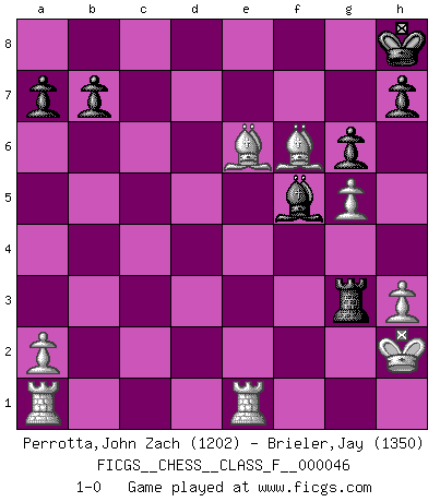 Last move : 1-0 2007 November 20 3:49:22 [Event "FICGS__CHESS__CLASS_F__000046"] [Site "FICGS"] [Date "2007.09.14"] [Round "1"] [White "Perrotta,John Zach"] [Black "Brieler,Jay"] [Result "1-0"] [WhiteElo "1202"] [BlackElo "1350"] 1.e4 c5 2.Nc3 d6 3.Nf3 Nf6 4.d4 cxd4 5.Nxd4 g6 6.Bc4 Bg7 7.O-O O-O 8.h3 Nc6 9.f4 d5 10.exd5 Nxd4 11.Qxd4 Bf5 12.Qf2 Rc8 13.Bb3 e6 14.dxe6 fxe6 15.Re1 Nh5 16.Be3 Bxc3 17.bxc3 Rxc3 18.g4 Nxf4 19.Qxf4 Bxc2 20.Bxe6+ Kh8 21.Qe5+ Qf6 22.Qxf6+ Rxf6 23.Bd4 Rcf3 24.g5 Rg3+ 25.Kh2 Bf5 26.Bxf6+ 1-0 Sicilian : Closed Kingside Castling by player White (move 7) Kingside Castling by player Black (move 7) Player White won this chess game. Follow this game move after move (download)In Chess, as it is played by masters, chance is practically eliminated. (Emanuel Lasker) Karpov ist ein Museumsstück. (Garry Kasparov) EL Ajedrez es como la vida. (Boris Spassky) Echiquier : carré parfait, comme la Jérusalem nouvelle décrite par l'auteur de l'Apocalypse, huit cases sur huit, exaltation du chiffre 4, symbole du cosmos aux quatre horizons... où le noir et le blanc, l'ombre et la lumière, le mal et le bien s'entremêlent et se conjuguent. (Robert Couffignal, Le Gambit du poète) Inventor: A person who makes an ingenious arrangement of wheels, levers and springs, and believes it civilization. (Ambrose Bierce, The Devil's Dictionary)