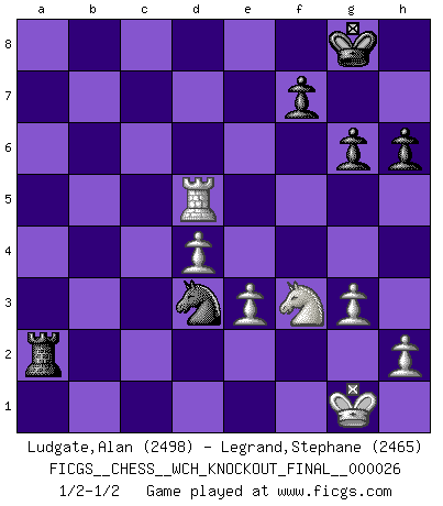 Last move : 1/2-1/2 2024 May 24 16:36:9 [Event "FICGS__CHESS__WCH_KNOCKOUT_FINAL__000026"] [Site "FICGS"] [Date "2024.03.29"] [Round "7"] [White "Ludgate,Alan"] [Black "Legrand,Stephane"] [Result "1/2-1/2"] [WhiteElo "2498"] [BlackElo "2465"] 1.d4 Nf6 2.c4 e6 3.Nf3 d5 4.g3 Be7 5.Bg2 O-O 6.O-O dxc4 7.Qc2 a6 8.a4 Bd7 9.Qxc4 Bc6 10.Bg5 Nbd7 11.Nc3 h6 12.Bxf6 Nxf6 13.b4 Bd5 14.Nxd5 exd5 15.Qb3 c6 16.e3 Bd6 17.Rfc1 g6 18.b5 axb5 19.axb5 Rxa1 20.Rxa1 Qb6 21.Rb1 Ra8 22.bxc6 Qxb3 23.Rxb3 Ra1+ 24.Bf1 bxc6 25.Rc3 Ra2 26.Rxc6 Ne4 27.Bd3 Nxf2 28.Rxd6 Nxd3 29.Rxd5 Ra1+ 30.Kg2 Ra2+ 31.Kg1 Ra1+ 32.Kg2 Ra2+ 33.Kg1 1/2-1/2 Follow this game move after move (download)Live, lose, and learn, by observing your opponent how to win. (Amber Steenbock) Im Wettkampf zwischen starken Meistern kommen Fehler sehr selten vor, deshalb ist es mit bloßem Warten nicht getan. (José Raúl Capablanca) Un sacrificio se refuta mucho mejor al aceptarlo. (Wilhelm Steinitz) À la honte des hommes, on sait que les lois du jeu sont les seules qui soient partout justes, claires, inviolables et exécutées. Pourquoi l'Indien qui a donné les règles du jeu d'échecs est-il obéi de bon gré dans toute la terre, et que les décrétales des papes, par exemple, sont aujourd'hui un objet d'horreur et de mépris ? C'est que l'inventeur des échecs combina tout avec justesse pour la satisfaction des joueurs, et que les papes, dans leurs décrétales, n'eurent en vue que leur seul avantage. L'Indien voulut exercer également l'esprit des hommes et leur donner du plaisir; les papes ont voulu abrutir l'esprit des hommes. Voltaire (Dictionnaire philosophique / Garnier 1967) If only people were all showed a certain minimum level of niceness; if only people didn't retract verbal draw offers (without draw box ticked) on ficgs; if only people didn't kill; if only people didn't run concentration / extermination camps, if only people didn't drop nuclear bombs on Hiroshima and Nagasaki, and so on - it would be a much more beautiful world. But sadly, things are not so... (Normajean Yates)