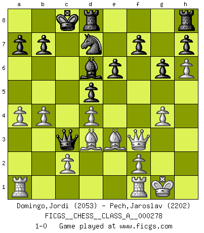 Last move : 1-0 2024 August 12 15:32:33 [Event "FICGS__CHESS__CLASS_A__000278"] [Site "FICGS"] [Date "2024.04.04"] [Round "1"] [White "Domingo,Jordi"] [Black "Pech,Jaroslav"] [Result "1-0"] [WhiteElo "2053"] [BlackElo "2202"] 1.e4 d5 2.exd5 Qxd5 3.Nc3 Qa5 4.d4 Nf6 5.Nf3 c6 6.Bc4 Bf5 7.Ne5 e6 8.g4 Bg6 9.h4 Nbd7 10.Nxd7 Nxd7 11.h5 Be4 12.O-O Bd5 13.Nxd5 cxd5 14.Bd3 Bd6 15.Qf3 O-O-O 16.b4 Qc7 17.a4 g6 18.h6 Qc3 19.Be3 1-0 This chess game has been lost on time (started : 2024.04.04 17:29:36) Follow this game move after move (download)Help your pieces so they can help you. (Paul Morphy) Es ist wirklich schade, dass so viele Schachspieler nicht auf ihr Äußeres achten! (Alexandra Kosteniuk) Alguna parte de un error es siempre correcto. (Savielly Tartakover) Les écrivains ont utilisé les échecs pour analyser les côtés extrêmes de la nature humaine. Dans ce cadre, les échecs offrent un champ d'expérimentation idéal. Mais on pourrait faire la même chose avec la peinture. Et là, en vous référant à Van Gogh, vous ne tirerez pas de conclusion définitive sur les peintres. (Gary Kasparov) Winning isn't everything... but losing is nothing. (Mednis)