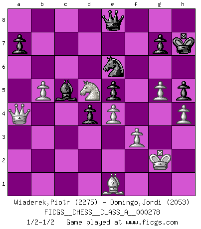 Last move : 1/2-1/2 2025 January 18 20:53:34 [Event "FICGS__CHESS__CLASS_A__000278"] [Site "FICGS"] [Date "2024.04.04"] [Round "1"] [White "Wiaderek,Piotr"] [Black "Domingo,Jordi"] [Result "1/2-1/2"] [WhiteElo "2275"] [BlackElo "2053"] 1.d4 d5 2.c4 dxc4 3.e4 e5 4.Nf3 exd4 5.Bxc4 Nc6 6.O-O Be6 7.Bxe6 fxe6 8.Qb3 Qd7 9.Qxb7 Rb8 10.Qa6 Bd6 11.Nbd2 Nge7 12.Nb3 e5 13.Qc4 Rb4 14.Qc2 O-O 15.Ne1 Ng6 16.Nd3 Rb6 17.Bd2 Nd8 18.Na5 Ne6 19.Nc4 R6b8 20.f3 h6 21.b3 Rf6 22.Rf2 Kh8 23.Ncb2 Qe7 24.Raf1 Rc8 25.b4 Rb8 26.g3 c5 27.Nc4 Bc7 28.a3 cxb4 29.axb4 Nef8 30.Rc1 Kh7 31.Qa4 Ra8 32.Kg2 Nd7 33.Na5 Bb6 34.h4 Ngf8 35.Rc6 Ne6 36.Nc4 Raf8 37.g4 Nd8 38.Rxf6 Rxf6 39.Be1 Ne6 40.Bd2 Nd8 41.Be1 Ne6 42.Rf1 Nf4+ 43.Nxf4 Rxf4 44.Bg3 Rf8 45.Qc6 Rf6 46.Qd5 Re6 47.Nb2 h5 48.g5 Nf8 49.Nd3 Ng6 50.Qb5 Bc7 51.Rc1 Rb6 52.Qd5 Rb8 53.Rc2 Bd6 54.Rc6 Rd8 55.b5 Bc7 56.Qb3 Bd6 57.Be1 Bb8 58.Bg3 Bd6 59.Be1 Bb8 60.Kg3 Rf8 61.Nb4 Qf7 62.Nd5 Ne7 63.Bb4 Nxc6 64.Bxf8 Nd8 65.Ba3 Ne6 66.Bc1 Qd7 67.Qc4 Bd6 68.Bd2 Bc5 69.Kh2 Kg6 70.Be1 Kh7 71.Kg2 Qe8 72.Bg3 Bd6 73.Be1 Bc5 74.Qa4 1/2-1/2 Follow this game move after move (download)Some part of a mistake is always correct. (Savielly Tartakover) Jede Eröffnung ist gut genug um gespielt zu werden, wenn nur ihr Ruf schlecht genug ist. (Savielly Grigorievitsch Tartakower) Del Ajedrez se ha dicho que la vida no es lo suficientemente larga para él, pero eso es culpa de la vida, no del Ajedrez. (William Ewart Napier) Il a essayé de se convaincre qu'il pourrait empêcher toutes les erreurs et ne jamais perdre. L'horreur ! Gary Kasparov au sujet de Robert Fischer. There are two types of people in this world, good and bad. The good sleep better, but the bad seem to enjoy the waking hours much more. (Woody Allen)