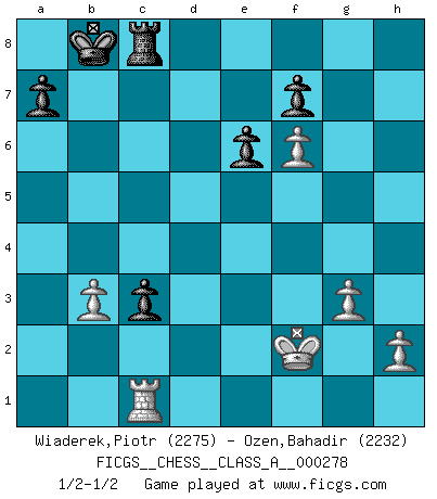 Last move : 1/2-1/2 2024 July 8 10:10:44 [Event "FICGS__CHESS__CLASS_A__000278"] [Site "FICGS"] [Date "2024.04.04"] [Round "1"] [White "Wiaderek,Piotr"] [Black "Ozen,Bahadir"] [Result "1/2-1/2"] [WhiteElo "2275"] [BlackElo "2232"] 1.d4 Nf6 2.c4 e6 3.Nf3 d5 4.Nc3 c6 5.Bg5 dxc4 6.e4 b5 7.e5 h6 8.Bh4 g5 9.Nxg5 hxg5 10.Bxg5 Nbd7 11.g3 Bb7 12.Bg2 Qb6 13.exf6 O-O-O 14.O-O c5 15.d5 b4 16.Na4 Qb5 17.a3 Nb8 18.axb4 cxb4 19.Qg4 Bxd5 20.Rfc1 Nc6 21.Bxd5 Rxd5 22.Rxc4 Rxg5 23.Qd4 Kb8 24.Rxc6 Rxg3+ 25.fxg3 Qxc6 26.Rd1 Qc7 27.b3 Kc8 28.Qe3 Kb8 29.Qd2 Bc5+ 30.Nxc5 Qxc5+ 31.Kg2 Qc6+ 32.Kg1 Qc5+ 33.Qd4 Qc3 34.Qxc3 bxc3 35.Rc1 Rc8 36.Kf2 1/2-1/2 Follow this game move after move (download)It is difficult to play against Einstein's theory --on his first loss to Fischer. (Mikhail Tal) Es ist nicht das erste mal, dass sich die FIDE dem Arabischen Geld gebeugt hat (über die FIDE WM 2004 in Lybien). (Larry Evans) El Ajedrez es un terrible juego. Si no controlas el centro, tu oponente tiene una posición mas holgada. Si tienes control del centro, ¡entonces realmente tu tienes algo de que preocuparte!. (Siegbert Tarrasch) Ce n'est pas pour s'amuser qu'il joue aux échecs : il célèbre un culte. (Vladimir Nabokov) I couldn't make any sense out of what this particular thread is about. It sounds like R2 D2 computer speaking. A space fight ?!? Some 'command' problems in Moscow ? Some killers & narcotic addicts attacking some game & a god wannabe ?? (Dinesh De Silva, lost in a russian conflict in FICGS forum)