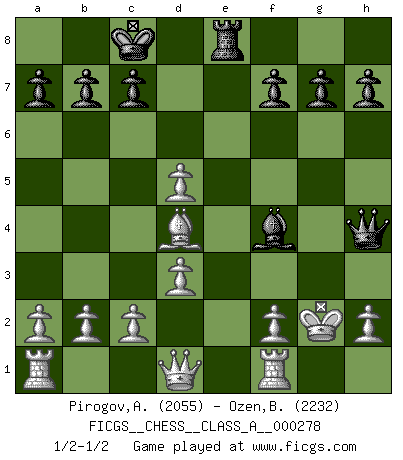 Last move : 1/2-1/2 2024 April 30 15:37:24 [Event "FICGS__CHESS__CLASS_A__000278"] [Site "FICGS"] [Date "2024.04.04"] [Round "1"] [White "Pirogov,Andrey Mikhaylovich"] [Black "Ozen,Bahadir"] [Result "1/2-1/2"] [WhiteElo "2055"] [BlackElo "2232"] 1.e4 e5 2.Nf3 Nc6 3.Bb5 Nf6 4.Nc3 Nd4 5.Bc4 Bc5 6.Nxe5 Qe7 7.Nf3 d5 8.Bxd5 Bg4 9.d3 O-O-O 10.Be3 Nxd5 11.Nxd5 Rxd5 12.exd5 Re8 13.O-O Bxf3 14.gxf3 Bd6 15.f4 Qh4 16.Bxd4 Bxf4 17.Kg2 Qg5+ 18.Kh1 Qh4 19.Kg2 Qg5+ 20.Kh1 Qh4 21.Kg2 1/2-1/2 Follow this game move after move (download)When you see a good move, look for a better one. (Emanuel Lasker) Wenn Capablanka heute auf der Schachbühne erscheinen würde, hätte er ein halbes Jahr gebraucht um sich die Schachtheorie anzueignen. Und dann hätte er alles und jeden besiegt. (Mikhail Moiseyevich Botvinik) Yo he agregado estos principios a la ley: pongan los Caballos en acción antes de que los dos Alfiles sean desarrollados. (Emanuel Lasker) Roi des jeux et jeu des rois, les échecs portent en eux un sentiment d'infini. Ils donnent à celui qui s'est efforcé d'en approfondir les arcanes l'impression de n'être pas à la mesure de l'homme; en fait, ils constituent un résumé de l'univers, un microcosme, et figurent cette grande échelle qui, dans les plans de la lumière descend jusqu'à la matière, qui des abîmes insondables remonte jusqu'en l'infini de Dieu. (Pyrame) Sometimes it pays to stay in bed in Monday, rather than spending the rest of the week debugging Monday's code. (Dan Salomon)