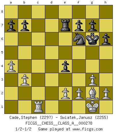 Last move : 1/2-1/2 2024 June 1 11:8:47 [Event "FICGS__CHESS__CLASS_A__000278"] [Site "FICGS"] [Date "2024.04.04"] [Round "1"] [White "Cade,Stephen"] [Black "Swiatek,Janusz"] [Result "1/2-1/2"] [WhiteElo "2297"] [BlackElo "2255"] 1.d4 Nf6 2.Nf3 d5 3.g3 c5 4.Bg2 cxd4 5.O-O h6 6.b3 e6 7.Bb2 Be7 8.Nxd4 e5 9.Nf3 e4 10.Nd4 Nc6 11.c4 O-O 12.Nd2 Nxd4 13.Bxd4 Bf5 14.Rc1 Rc8 15.cxd5 Rxc1 16.Qxc1 Qxd5 17.Qc4 Qxc4 18.Nxc4 Rd8 19.Ne3 Rxd4 20.Nxf5 Rd7 21.Nxe7+ Rxe7 22.Rc1 Kh7 23.a4 Kg6 1/2-1/2 Follow this game move after move (download)You cannot play at Chess if you are kind-hearted. (French Proverb) Die Leute spielen gegen mich seit 15 Jahren unter Ihren Möglichkeiten. (Robert James Fischer) Creo que una cierta cantidad de temperamento es esperada de los genios del Ajedrez. (Ron Gross) Il s'avisa de me proposer d'apprendre les échecs qu'il jouait un peu... me voilà forcené des échecs. J'achète un échiquier, je m'enferme dans ma chambre, j'y passe des jours et des nuits à vouloir apprendre par cur toutes les parties. (Jean-Jacques Rousseau, Confessions) I would love to change the world, but they won't give me the source code. (Unknown)