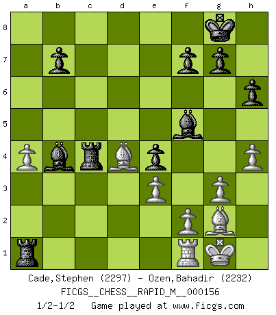 Last move : 1/2-1/2 2024 May 1 11:8:2 [Event "FICGS__CHESS__RAPID_M__000156"] [Site "FICGS"] [Date "2024.04.06"] [Round "1"] [White "Cade,Stephen"] [Black "Ozen,Bahadir"] [Result "1/2-1/2"] [WhiteElo "2297"] [BlackElo "2232"] 1.d4 Nf6 2.Nf3 d5 3.g3 c5 4.Bg2 cxd4 5.O-O h6 6.b3 e6 7.Bb2 Bc5 8.Nxd4 e5 9.Nf3 e4 10.Nd4 O-O 11.c4 Re8 12.cxd5 Nxd5 13.e3 Nd7 14.Nc3 Nxc3 15.Bxc3 Bf8 16.Nb5 Nc5 17.Qxd8 Rxd8 18.Nc7 Rb8 19.Bd4 Bf5 20.b4 Rbc8 21.Nb5 Ne6 22.Bxa7 Bxb4 23.a4 Rd2 24.h4 R8c2 25.Rab1 Rc4 26.Nd4 Nxd4 27.Bxd4 Ra2 28.Ra1 Rxa1 1/2-1/2 Follow this game move after move (download)The Pawns are the soul of the game. (Francois Andre Danican Philidor) Das Spiel gibt uns die Genugtuung, die das Leben uns versagt. (Emanuel Lasker) El Ajedrez es un terrible juego. Si no controlas el centro, tu oponente tiene una posición mas holgada. Si tienes control del centro, ¡entonces realmente tu tienes algo de que preocuparte!. (Siegbert Tarrasch) Psychologiquement, tu dois avoir confiance en toi même, mais cette confiance doit être basée sur des faits. (Robert Fischer) Kids, you tried your best and you failed miserably. The lesson is, never try. (Simpsons)