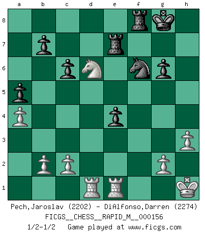 Last move : 1/2-1/2 2024 June 29 12:58:0 [Event "FICGS__CHESS__RAPID_M__000156"] [Site "FICGS"] [Date "2024.04.06"] [Round "1"] [White "Pech,Jaroslav"] [Black "DiAlfonso,Darren"] [Result "1/2-1/2"] [WhiteElo "2202"] [BlackElo "2274"] 1.e4 g6 2.d4 Bg7 3.Nc3 d6 4.Be3 Nf6 5.Qd2 c6 6.Nf3 O-O 7.h3 Nbd7 8.a4 e5 9.dxe5 Nxe5 10.Nxe5 dxe5 11.Qxd8 Rxd8 12.Bc4 Bf8 13.O-O a5 14.f4 Be6 15.Bxe6 fxe6 16.f5 exf5 17.exf5 Nd5 18.Bg5 Bc5+ 19.Kh1 Rf8 20.Ne4 Be3 21.fxg6 hxg6 22.Rfe1 Bxg5 23.Nxg5 Rae8 24.Ne4 Re7 25.Rad1 Nf6 26.Nd6 e4 1/2-1/2 Follow this game move after move (download)I play correspondence chess because it is both art and science while chess is art only. (A player at FICGS) Ich brauche nur einen Blick auf das Schachbrett zu werfen, und weiß schon, was in der Stellung steckt, was geschehen kann und was geschehen wird. Alle übrigen suchen und prüfen, ich aber weiß es! (José Raúl Capablanca) Aún deseo matar a Fischer. (Boris Spassky) Botvinnik disait en comparant les échecs à la musique: Il existe une science dont le but est l'étude de l'acoustique et des sons. Mais il y a aussi un art qui se sert de l'océan des sons : c'est la musique. De toute évidence, il en est de même pour la pensée. La logique est l'étude des lois de la réflexion et les échecs reflètent, en tant qu'art, le côté logique de la réflexion, sous la forme d'images artistiques... Extrait de Fischer - Spassky, Reykjavik 1972 par Alexander & F. Wyndham (Ed. Solar), p 37. Unless in communicating with it one says exactly what one means, trouble is bound to result. (Alan Turing, about computers)