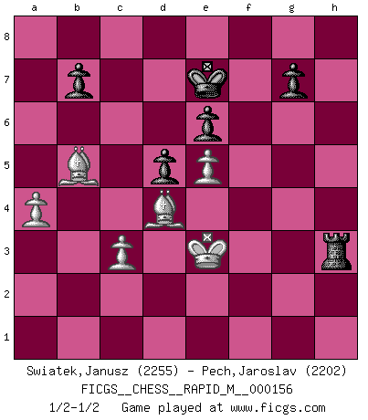 Last move : 1/2-1/2 2024 October 6 20:13:43 [Event "FICGS__CHESS__RAPID_M__000156"] [Site "FICGS"] [Date "2024.04.06"] [Round "1"] [White "Swiatek,Janusz"] [Black "Pech,Jaroslav"] [Result "1/2-1/2"] [WhiteElo "2255"] [BlackElo "2202"] 1.e4 d5 2.exd5 Qxd5 3.Nc3 Qa5 4.d4 Nf6 5.Nf3 c6 6.Bc4 Bf5 7.Ne5 e6 8.g4 Bg6 9.h4 Nbd7 10.Nxd7 Nxd7 11.h5 Be4 12.O-O Bd5 13.Nxd5 cxd5 14.Bd3 Bd6 15.a4 Qd8 16.Kg2 O-O 17.Qf3 h6 18.c3 Nf6 19.Bd2 Nh7 20.Qe2 Qc7 21.f4 Rae8 22.g5 f5 23.Kh1 hxg5 24.fxg5 Bg3 25.Rf3 f4 26.Qe5 Qxe5 27.dxe5 Nxg5 28.Rxg3 fxg3 29.Bxg5 Rf2 30.Be3 Rh2+ 31.Kg1 Rf8 32.Bf1 Rf3 33.Bxa7 Rxb2 34.Bh3 Kf7 35.Rf1 Rxf1+ 36.Bxf1 Rc2 37.Bd4 Rh2 38.Bb5 Rxh5 39.Kg2 Rh2+ 40.Kxg3 Rh1 41.Bd7 Ra1 42.Kf3 Ke7 43.Bb5 Kf7 44.Ke2 Ra2+ 45.Kd3 Ra1 46.Bd7 Rh1 47.Be3 Ke7 48.Bc8 Ra1 49.Bc5+ Kf7 50.Bd7 Rh1 51.Bf2 Ke7 52.Bc8 Ra1 53.Bc5+ Kf7 54.Bd7 Rd1+ 55.Kc2 Rh1 56.Be3 Rh8 57.Kd3 Ke7 58.Bb5 Rh3 59.Ke2 Rh5 60.Bd4 Rh2+ 61.Ke3 Rh3+ 62.Ke2 Rh2+ 63.Ke3 Rh3+ 1/2-1/2 Follow this game move after move (download)Chess books should be used as we use glasses: to assist the sight, although some players make use of them as if they thought they conferred sight. (Jose Raul Capablanca) Im Schach nämlich geht es darum, daß Ich des Gegners klein zu kriegen, sein Ego zu zerbrechen und zu zermahlen, seine Selbstachtung zu zertreten und zu verscharren und seine ganze mißachtenswerte sogenannte Persönlichkeit ein für alle Mal tot zu hacken und zu zerstampfen und dadurch die menschliche Gesellschaft von einer stinkenden Pestbeule zu befreien. Es ist ein königliches Spiel. (Robert James Fischer) ¿Porque tengo que perder ante este idiota?. (Aron Nimzovich) Les échecs sont plus proches de l'art de l'assassinat que de l'art de la guerre. (Arturo Perez-Reverte) Dave, my mind is going. I can feel it. (HAL 9000 in 2001, a space odyssey)