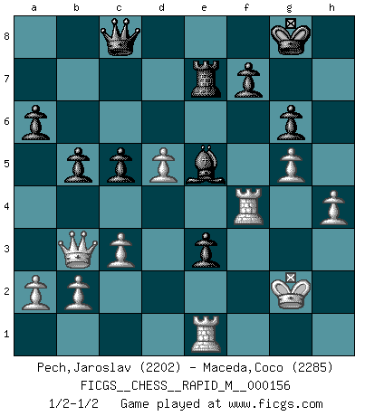 Last move : 1/2-1/2 2024 July 19 18:42:34 [Event "FICGS__CHESS__RAPID_M__000156"] [Site "FICGS"] [Date "2024.04.06"] [Round "1"] [White "Pech,Jaroslav"] [Black "Maceda,Coco"] [Result "1/2-1/2"] [WhiteElo "2202"] [BlackElo "2285"] 1.e4 c5 2.Nf3 d6 3.d4 cxd4 4.Nxd4 Nf6 5.Nc3 a6 6.Be3 e5 7.Nb3 Be6 8.f3 h5 9.Qd2 Nbd7 10.Nd5 Bxd5 11.exd5 g6 12.Be2 Bg7 13.O-O b6 14.Kh1 O-O 15.Rad1 Re8 16.g4 hxg4 17.fxg4 Ne4 18.Qb4 Ndc5 19.Nxc5 Nxc5 20.g5 e4 21.Rf2 Re7 22.h4 Qd7 23.Kg2 Na4 24.Rdf1 Rc8 25.c3 b5 26.Rf4 Nc5 27.Bg4 Qd8 28.Bxc8 Qxc8 29.Bxc5 dxc5 30.Qb3 e3 31.Re1 Be5 32.Re4 Bd4 33.Rf4 Be5 34.Re4 Bd4 35.Rf4 Be5 1/2-1/2 Follow this game move after move (download)There are tough players and nice guys, and I'm a tough player. (Bobby Fischer) Jeder leidlich begabte Spieler, er braucht keineswegs hervorragend veranlagt zu sein, kann es zum Meister bringen. Aber das ist ja auch gar nicht nötig! Der richtige Standpunkt ist es, zu seinem Vergnügen zu spielen, und man glaube ja nicht, dass der Genuss proportional dem Können sei. (Siegbert Tarrasch) Yo nunca en mi vida he jugado la Defensa Francesa, que viene siendo la más aburrida de todas las Aperturas. (Wilhelm Steinitz) Nous sommes les pions de la mystérieuse partie d'Echecs jouée par Dieu. Il nous déplace, nous arrête, nous pousse encore, puis nous lance un à un dans la boîte du Néant. Epitaphe sur la tombe de David Janowsky (1868-1927). Computer Science is no more about computers than astronomy is about telescopes. (Edsger W. Dijkstra)
