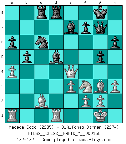 Last move : 1/2-1/2 2024 May 9 4:2:3 [Event "FICGS__CHESS__RAPID_M__000156"] [Site "FICGS"] [Date "2024.04.06"] [Round "1"] [White "Maceda,Coco"] [Black "DiAlfonso,Darren"] [Result "1/2-1/2"] [WhiteElo "2285"] [BlackElo "2274"] 1.d4 d5 2.Nf3 e6 3.c4 Nf6 4.Nc3 c5 5.cxd5 cxd4 6.Qxd4 exd5 7.Bg5 Be7 8.e3 O-O 9.Be2 Nc6 10.Qd3 h6 11.Bh4 Qb6 12.O-O Rd8 13.Rfd1 Be6 14.h3 a6 15.a3 g5 16.Bg3 Ne4 17.Nxe4 dxe4 18.Qxe4 Qxb2 19.Bd3 Qg7 20.Bc2 Bd5 21.Qg4 Be6 22.Qa4 b5 23.Qe4 Rac8 24.a4 Bd5 25.Qg4 Be6 26.Qe4 Bd5 1/2-1/2 Follow this game move after move (download)In order to improve your game, you must study the endgame before everything else, for whereas the endings can be studied and mastered by themselves, the middle game and the opening must be studied in relation to the endgame. (Jose Raul Capablanca) Ich hatte Angst gegen einen russischen Großmeister zu verlieren, und er befürchtete gegen einen kleinen Jungen zu verlieren. (über ein Remis gegen Juri Awerbach). (Robert James Fischer) Debió haber existido una vez en que los hombres eran semidióses, de otra manera no hubiesen podido inventar el Ajedrez. (Gustav Schenk) C'est une question de caractère, Beaucoup de gens perdent leur motivation très vite. D'autres, ils sont rares, peuvent la conserver très longtemps. J'aime les échecs, encore aujourd'hui je suis heureux d'analyser des parties. J'aime toujours gagner, je déteste encore perdre. Bien jouer est important pour mon intégrité intellectuelle et morale. Et puis les échecs vivent en ce moment une période historique grâce à Internet. Ils se développent dans les systèmes éducatifs à travers le monde. Ils sortent de leur ghetto, et c'est mon rôle de mener à bien cette révolution. (Gary Kasparov) Industry executives and analysts often mistakenly talk about strategy as if it were some kind of chess match. But in chess, you have just two opponents, each with identical resources, and with luck playing a minimal role. The real world is much more like a poker game, with multiple players trying to make the best of whatever hand fortune has dealt them. In our industry, Bill Gates owns the table until someone proves otherwise. (David Moschella, 'Computerworld')