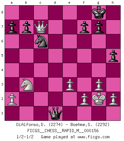 Last move : 1/2-1/2 2024 May 2 1:0:40 [Event "FICGS__CHESS__RAPID_M__000156"] [Site "FICGS"] [Date "2024.04.06"] [Round "1"] [White "DiAlfonso,Darren"] [Black "Boehme,Sebastian"] [Result "1/2-1/2"] [WhiteElo "2274"] [BlackElo "2292"] 1.b4 e5 2.Bb2 Bxb4 3.Bxe5 Nf6 4.c3 Be7 5.d4 c5 6.e3 d5 7.Bxf6 Bxf6 8.g3 Nc6 9.Nd2 O-O 10.Ne2 Re8 11.Bg2 cxd4 12.cxd4 Bxd4 13.Nxd4 Nxd4 14.O-O Nc6 15.Nb3 Be6 16.Rc1 Qe7 17.Nc5 Rad8 18.Qa4 Rd6 19.Rfd1 Red8 20.Qb3 Bg4 21.Rxd5 Rxd5 22.Bxd5 Na5 23.Qd3 Qg5 24.Qe4 Qxd5 25.Qxg4 Qd2 26.Ra1 Qc2 27.Nb3 Nc6 28.Qf4 h5 29.Qc7 Rd1+ 30.Rxd1 Qxd1+ 31.Kg2 Qd5+ 32.Kg1 Qd1+ 33.Kg2 1/2-1/2 Follow this game move after move (download)I am still a victim of Chess. It has all the beauty of art and much more. It cannot be commercialized. Chess is much purer than art in its social position. (Marcel Duchamp) Ich habe kein Problem mit Frauen, sondern nur mit dem Niveau ihres Schachspiels (Judith Polgar) El Ajedrez es una guerra en un tablero. El objetivo es aplastar la mente del oponente. (Bobby Fischer) Fischer est le meilleur joueur du monde et Karpov n'est qu'un joueur de bistrot. (Garry Kasparov, agé de 16 ans) In my experience, there's no such thing as luck. (Obi-Wan Kenobi in Star Wars ep.4)