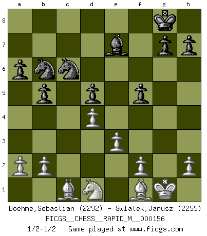 Last move : 1/2-1/2 2024 June 10 0:10:37 [Event "FICGS__CHESS__RAPID_M__000156"] [Site "FICGS"] [Date "2024.04.06"] [Round "1"] [White "Boehme,Sebastian"] [Black "Swiatek,Janusz"] [Result "1/2-1/2"] [WhiteElo "2292"] [BlackElo "2255"] 1.d4 Nf6 2.c4 e6 3.g3 Bb4+ 4.Bd2 Be7 5.Bg2 d5 6.Nf3 c6 7.Qc2 b6 8.O-O O-O 9.Ne5 Bb7 10.Bf4 Nbd7 11.Rd1 Nh5 12.Bd2 Nhf6 13.cxd5 cxd5 14.Nc6 Bxc6 15.Qxc6 a6 16.Rc1 Rc8 17.Qxc8 Qxc8 18.Rxc8 Rxc8 19.Nc3 b5 20.Rc1 Nb6 21.Nd1 Rxc1 22.Bxc1 Nfd7 23.g4 Nb8 24.e3 Nc6 25.Bf1 f5 26.gxf5 exf5 1/2-1/2 Follow this game move after move (download)Mistrust is the most necessary characteristic of the Chess player. (Siegbert Tarrasch) Irgendwie scheint mir sonntags früh um 9 Uhr der Killerinstinkt verloren gegangen zu sein. (Alexej Shirov) Un Peón pasado aumenta su poder a medida de que el número de piezas en el tablero disminuye. (Capablanca) Les pièces de l'échiquier étaient impitoyables. Elles le retenaient, elles l'absorbaient. Il y avait de l'horreur en cela, mais aussi une harmonie unique. Car, qu'y a-t-il dans le monde, à part les échecs ? (V. Nabokov) The weakness of an artist is dogma. (Josh Waitzkin)