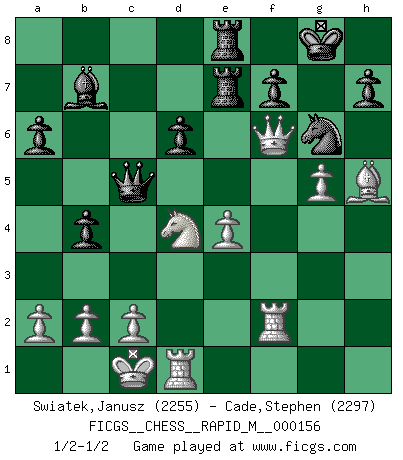 Last move : 1/2-1/2 2024 June 5 11:42:45 [Event "FICGS__CHESS__RAPID_M__000156"] [Site "FICGS"] [Date "2024.04.06"] [Round "1"] [White "Swiatek,Janusz"] [Black "Cade,Stephen"] [Result "1/2-1/2"] [WhiteElo "2255"] [BlackElo "2297"] 1.e4 c5 2.Nf3 d6 3.d4 cxd4 4.Nxd4 Nf6 5.Nc3 a6 6.Bg5 e6 7.f4 Be7 8.Qf3 Qc7 9.O-O-O Nbd7 10.g4 b5 11.Bxf6 Nxf6 12.g5 Nd7 13.f5 O-O 14.Rg1 b4 15.Nce2 e5 16.f6 exd4 17.fxe7 Re8 18.Nxd4 Ne5 19.Qf4 Qc5 20.Rg2 g6 21.h4 Rxe7 22.Be2 Bb7 23.Rf2 Rae8 24.h5 gxh5 25.Bxh5 Ng6 26.Qf6 1/2-1/2 Follow this game move after move (download)A thorough understanding of the typical mating continuations makes the most complicated sacrificial combinations leading up to them not only not difficult, but almost a matter of course. (Siegbert Tarrasch) Gewinnen beim Schach fördert das Selbstvertrauen. Beim Sex spüre ich sowas nicht... (Garry Kasparov) El Ajedrez es tortura mental. (Garry Kasparov) Le thème de l'attaque double intervient d'une manière ou d'une autre dans l'immense majorité des combinaisons. (Youri Averbakh) Mandala - that's it! 16x16 squares as multiple of the four and the eight because of the Four Noble Truths and the Noble Eightfold Path. (Heinz-Georg Lehnhoff about Big Chess)