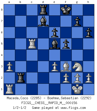 Last move : 1/2-1/2 2024 May 30 10:51:27 [Event "FICGS__CHESS__RAPID_M__000156"] [Site "FICGS"] [Date "2024.04.06"] [Round "1"] [White "Maceda,Coco"] [Black "Boehme,Sebastian"] [Result "1/2-1/2"] [WhiteElo "2285"] [BlackElo "2292"] 1.d4 Nf6 2.c4 e6 3.Nf3 d5 4.Nc3 Bb4 5.Bg5 h6 6.Bxf6 Qxf6 7.e3 O-O 8.Rc1 dxc4 9.Bxc4 c5 10.O-O cxd4 11.Ne4 Qe7 12.Nxd4 Bd7 13.Be2 Nc6 14.a3 Nxd4 15.Qxd4 Ba5 16.Qc5 Bd8 17.Qxe7 Bxe7 18.Rc7 Rfd8 19.Rxb7 Rab8 20.Rxa7 Rxb2 21.Bf3 Kf8 22.Ra1 f5 23.Ng3 Bc5 24.Rc7 Bd6 25.R7c1 Be5 26.Rc5 Bd6 27.R5c1 Be5 28.Rc5 1/2-1/2 Follow this game move after move (download)It began to feel as though you were playing against Chess itself. - On playing against Robert Fischer. (Walter Shipman) Als er Schachweltmeister wurde ließ er praktisch alle stärksten Sovietspieler für sich arbeiten. Wenn ein auch nur mittelmässiger Meister ein Spezialist für eine bestimmte Eröffnung war, wurde er von Karpov gerufen. Das wurde alles geheim gehalten. (Mikhail Moiseyevich Botvinik) Debes de llevar a tu oponente hacia un profundo y obscuro bosque donde 2+2=5, y el camino que conduce a la salida es suficientemente ancho para solamente uno. (Mikhail Tal) Le moment que je préfère le plus dans une rencontre, c'est celui où je sens que la personnalité de l'adversaire se brise. (Robert Fischer) May I never be complete. May I never be content. May I never be perfect. Deliver me, Tyler, from being perfect and complete. (Chuck Palahniuk, Fight Club)