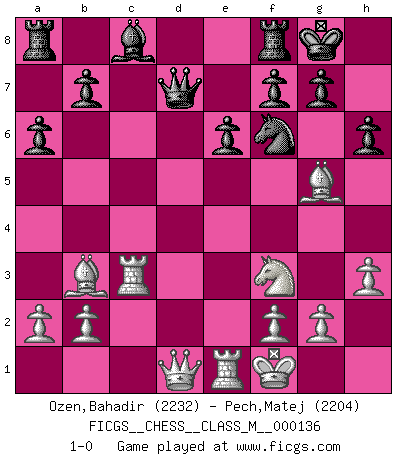 Last move : 1-0 2024 July 11 17:23:16 [Event "FICGS__CHESS__CLASS_M__000136"] [Site "FICGS"] [Date "2024.04.07"] [Round "1"] [White "Ozen,Bahadir"] [Black "Pech,Matej"] [Result "1-0"] [WhiteElo "2232"] [BlackElo "2204"] 1.e4 e6 2.d4 d5 3.Nd2 c5 4.Ngf3 cxd4 5.exd5 Qxd5 6.Bc4 Qd6 7.O-O Nf6 8.Nb3 Nc6 9.Nbxd4 Nxd4 10.Nxd4 a6 11.Bb3 Qc7 12.Re1 Bd6 13.h3 O-O 14.Bg5 Bh2+ 15.Kf1 Be5 16.c3 h6 17.Nf3 Bxc3 18.Rc1 Qd7 19.Rxc3 1-0 This chess game has been lost on time (started : 2024.04.07 10:56:24) Follow this game move after move (download)Chess is above all, a fight ! (Emanuel Lasker) Schachspieler können ausgezeichnet Varianten am Schachbrett berechnen, aber nicht im realen Leben. Zu stark ist der Individualismus im Schach ausgeprägt, und für viele ist ein kleiner momentaner persönlicher Vorteil wichtiger als ein weit größerer Vorteil von morgen. (Anatoly Karpov) Yo nunca en mi vida he jugado la Defensa Francesa, que viene siendo la más aburrida de todas las Aperturas. (Wilhelm Steinitz) Les Echecs représentent une sphère d'idées créatrices basée sur la volonté des deux protagonistes. (Smyslov) Always be a first-rate version of yourself, instead of a second-rate version of somebody else. (Judy Garland)