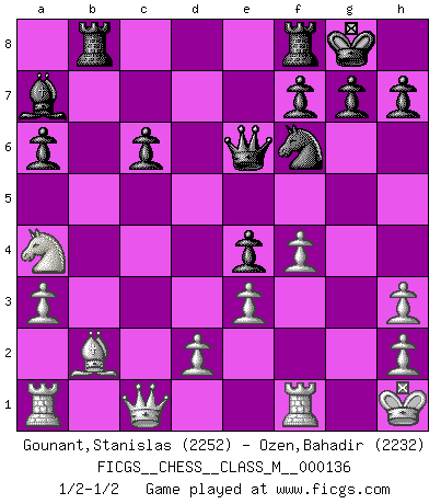 Last move : 1/2-1/2 2024 April 29 0:45:32 [Event "FICGS__CHESS__CLASS_M__000136"] [Site "FICGS"] [Date "2024.04.07"] [Round "1"] [White "Gounant,Stanislas"] [Black "Ozen,Bahadir"] [Result "1/2-1/2"] [WhiteElo "2252"] [BlackElo "2232"] 1.b3 e5 2.Bb2 Nc6 3.e3 Nf6 4.Bb5 Bd6 5.Na3 Na5 6.Be2 a6 7.Nh3 Qe7 8.Nb1 b5 9.O-O O-O 10.c4 bxc4 11.bxc4 Rb8 12.Qc1 c6 13.Nc3 Bb4 14.f4 e4 15.Na4 d5 16.c5 Bxh3 17.gxh3 Nc4 18.Bxc4 dxc4 19.a3 c3 20.Nxc3 Bxc5 21.Na4 Ba7 22.Kh1 Qe6 1/2-1/2 Follow this game move after move (download)The boy (then a 12 year old boy named Anatoly Karpov) doesn't have a clue about Chess, and there's no future at all for him in this profession. (Mikhail Botvinnik) Ich würde mich als ganz normalen Jungen bezeichnen [Im Alter von 12]. (Sergej Karjakin) Cuando tengas duda... ¡juega al Ajedrez!. (Tevis) Les Cavaliers se révèlent fort utiles dans les positions fermées. D'habitude, les Fous sont un peu plus forts que les Cavaliers dans les positions ouvertes. Qu'on le veuille ou non, il restera toujours des exceptions ! The only thing that overcomes hard luck is hard work. (Harry Golden)