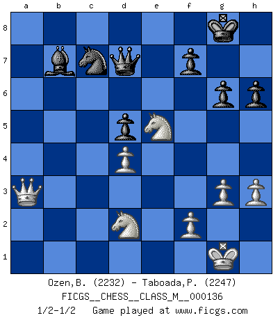 Last move : 1/2-1/2 2024 June 2 8:46:1 [Event "FICGS__CHESS__CLASS_M__000136"] [Site "FICGS"] [Date "2024.04.07"] [Round "1"] [White "Ozen,Bahadir"] [Black "Taboada,Pedro Pablo"] [Result "1/2-1/2"] [WhiteElo "2232"] [BlackElo "2247"] 1.e4 e5 2.Nf3 Nc6 3.Bb5 a6 4.Ba4 Nf6 5.O-O Be7 6.Re1 b5 7.Bb3 O-O 8.h3 d6 9.c3 Bb7 10.d4 Re8 11.Ng5 Rf8 12.Nf3 Re8 13.Nbd2 Bf8 14.a3 h6 15.Bc2 Nb8 16.b3 Nbd7 17.Bb2 g6 18.a4 c6 19.Bd3 Nh5 20.Bf1 Nf4 21.axb5 axb5 22.Rxa8 Bxa8 23.Qc1 Bb7 24.b4 exd4 25.g3 Ne6 26.cxd4 d5 27.exd5 cxd5 28.Bxb5 Bxb4 29.Ba3 Bxa3 30.Qxa3 Nc7 31.Rxe8+ Qxe8 32.Bxd7 Qxd7 33.Ne5 1/2-1/2 Follow this game move after move (download)Chess is not like life... it has rules ! (Mark Pasternak) Man wirke der falschen Auffassung entgegen, als ob jeder Zug Unmittelbares zu leisten habe; auch Werte- und Ruhezüge haben ihre Existenzberechtigung. (Aaron Nimzowitsch) La vida es como un juego de Ajedrez, cambiando con cada movimiento. (Proverbio Chino) Psychologiquement, tu dois avoir confiance en toi même, mais cette confiance doit être basée sur des faits. (Robert Fischer) What doesn't kill us makes us stronger. (Friedrich Nietzsche)