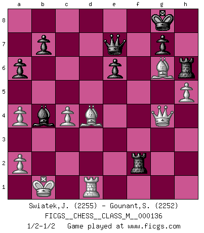 Last move : 1/2-1/2 2024 June 9 20:36:55 [Event "FICGS__CHESS__CLASS_M__000136"] [Site "FICGS"] [Date "2024.04.07"] [Round "1"] [White "Swiatek,Janusz"] [Black "Gounant,Stanislas"] [Result "1/2-1/2"] [WhiteElo "2255"] [BlackElo "2252"] 1.e4 e6 2.d4 d5 3.Nc3 dxe4 4.Nxe4 Nd7 5.Nf3 Ngf6 6.Nxf6+ Nxf6 7.Bd3 c5 8.Be3 Qc7 9.Qe2 a6 10.h4 Bd7 11.O-O-O Rc8 12.Ne5 Ba4 13.b3 Nd5 14.c4 Nc3 15.Qg4 cxd4 16.Bxd4 h5 17.Qg5 Nxd1 18.Rxd1 Ba3+ 19.Kb1 f6 20.Qe3 fxe5 21.Bg6+ Kf8 22.Bxe5 Qe7 23.bxa4 Kg8 24.g4 hxg4 25.h5 Rh6 26.Qf4 Rf8 27.Qxg4 Rxf2 28.Bc3 Bb4 29.Bd4 1/2-1/2 Follow this game move after move (download)If I win a tournament, I win it by myself. I do the playing. Nobody helps me. (Bobby Fischer) Ich würde die 30 stärksten Spieler der USA im Simultanspiel besiegen. (José Raúl Capablanca) Algunos sacrificios son sólidos, los demás son míos. (Mikhail Tal) En blitz, le Cavalier l'emporte sur le Fou. (Vlastimil Hort) Statistics can be made to prove anything - even the truth. (Author unknown)