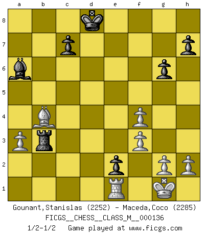 Last move : 1/2-1/2 2024 May 23 6:4:33 [Event "FICGS__CHESS__CLASS_M__000136"] [Site "FICGS"] [Date "2024.04.07"] [Round "1"] [White "Gounant,Stanislas"] [Black "Maceda,Coco"] [Result "1/2-1/2"] [WhiteElo "2252"] [BlackElo "2285"] 1.b3 e5 2.Bb2 Nc6 3.e3 b6 4.c4 Bb7 5.Nc3 Nf6 6.Nf3 Qe7 7.Nd5 Qd6 8.Nxf6+ Qxf6 9.Bd3 g6 10.Be4 Bg7 11.O-O Qe7 12.d4 d6 13.dxe5 dxe5 14.Qe2 f5 15.Bd5 O-O-O 16.a3 Rd6 17.Rfe1 Re8 18.Rad1 e4 19.Bxc6 Bxc6 20.Nd4 Ba8 21.b4 f4 22.c5 Rd5 23.Qa6+ Bb7 24.Qxa7 bxc5 25.bxc5 Bxd4 26.Rxd4 Qxc5 27.Qa4 Qb5 28.exf4 e3 29.f3 Ba6 30.Qxb5 Rxb5 31.Bc3 Rb3 32.Bb4 Rd8 33.Rxd8+ Kxd8 34.Bc5 e2 35.Bb4 1/2-1/2 Follow this game move after move (download)My style is somewhere between that of Tal and Petrosian. (Reshevsky) Alle Schachspieler sollten auch ein Hobby haben. (Savielly Grigorievitsch Tartakower) No hay precio que sea tan grande por la cabellera del Rey enemigo. (Koblentz) Fischer est le meilleur joueur du monde et Karpov n'est qu'un joueur de bistrot. (Garry Kasparov, agé de 16 ans) May the force be with you. (Han Solo in Star Wars ep.4)