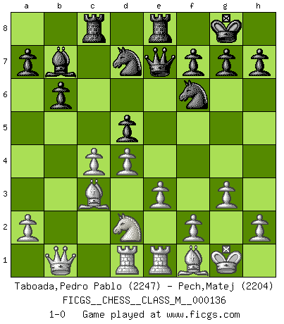 Last move : 1-0 2024 August 1 3:42:53 [Event "FICGS__CHESS__CLASS_M__000136"] [Site "FICGS"] [Date "2024.04.07"] [Round "1"] [White "Taboada,Pedro Pablo"] [Black "Pech,Matej"] [Result "1-0"] [WhiteElo "2247"] [BlackElo "2204"] 1.d4 d5 2.Nf3 Nf6 3.c4 c6 4.Nc3 e6 5.e3 Nbd7 6.Qc2 Bd6 7.b3 O-O 8.Be2 b6 9.O-O Bb7 10.Bb2 Qe7 11.Rad1 Rad8 12.Rfe1 Rfe8 13.Bf1 c5 14.cxd5 exd5 15.g3 Rc8 16.Qb1 c4 17.bxc4 Bb4 18.Nd2 Bxc3 19.Bxc3 1-0 This chess game has been lost on time (started : 2024.04.07 10:56:24) Follow this game move after move (download)All Chess players should have a hobby. (Savielly Tartakower) Wie bekannt hörte Morphy 1859 auf, Schach zu spielen. Seine Enttäuschung galt nicht so sehr dem Schach, wie den Schachspielern. (Robert James Fischer) Hoy en día, si tu no eres un Gran Maestro a los 14 años, es mejor que lo olvides. (Anand Viswanathan) On peut tirer plus d'utilité d'une partie perdue que de 100 parties gagnées. (Capablanca) There are two major products that came out of Berkeley: LSD and UNIX. We do not believe this is to be a coincidence. (Jeremy S. Anderson)