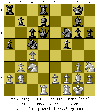 Last move : 0-1 2024 July 11 3:53:1 [Event "FICGS__CHESS__CLASS_M__000136"] [Site "FICGS"] [Date "2024.04.07"] [Round "1"] [White "Pech,Matej"] [Black "Cirulis,Ilmars"] [Result "0-1"] [WhiteElo "2204"] [BlackElo "2214"] 1.c4 f5 2.d4 Nf6 3.Nc3 g6 4.g3 c6 5.Bg2 Bg7 6.Nf3 d6 7.O-O O-O 8.d5 e5 9.dxe6 Bxe6 10.b3 Na6 11.Bb2 Qe7 12.Ng5 Bd7 13.Qc2 Nc5 14.Rad1 a5 15.Qd2 h6 16.Nh3 Rfd8 17.Qxd6 Qxd6 0-1 This chess game has been lost on time (started : 2024.04.07 10:56:24) Follow this game move after move (download)Chess is the gymnasium of the mind. (Blaise Pascal) Vom Schach wurde gesagt das Leben sei dafür nicht lange genug. Aber das ist der Fehler des Lebens, nicht des Schach'. (Irving Chernev) Alekhine es un poeta que crea un trabajo de arte de algo que raramente inspiraría a otra persona a mandar una tarjeta postal. (Max Euwe) Le moment que je préfère le plus dans une rencontre, c'est celui où je sens que la personnalité de l'adversaire se brise. (Robert Fischer) Be who you are, and say what you feel because those who mind don't matter, and those who matter don't mind. (Dr Seuss)