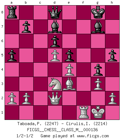 Last move : 1/2-1/2 2024 June 23 17:50:50 [Event "FICGS__CHESS__CLASS_M__000136"] [Site "FICGS"] [Date "2024.04.07"] [Round "1"] [White "Taboada,Pedro Pablo"] [Black "Cirulis,Ilmars"] [Result "1/2-1/2"] [WhiteElo "2247"] [BlackElo "2214"] 1.d4 f5 2.c4 Nf6 3.g3 g6 4.Bg2 Bg7 5.Nc3 c6 6.Nh3 d6 7.O-O O-O 8.d5 h6 9.Nf4 g5 10.Nd3 e5 11.e4 cxd5 12.cxd5 fxe4 13.Nxe4 Nxe4 14.Bxe4 Nd7 15.Be3 Nf6 16.f3 g4 17.Nf2 Nxe4 18.fxe4 h5 19.Qd2 Bd7 20.Nd3 Rxf1+ 21.Rxf1 a5 22.Bg5 Qb6+ 23.Be3 Qd8 24.Bg5 Qb6+ 25.Be3 Qd8 1/2-1/2 Follow this game move after move (download)The Chess pieces are the block alphabet which shapes thoughts; and these thoughts, although making a visual design on the chessboard, express their beauty abstractly, like a poem. (Marcel Duchamp) Karpov ist ein Museumsstück. (Garry Kasparov) No nos podemos resistir a la fascinación de un sacrificio ya que la pasión por los sacrificios es parte de la naturaleza de un jugador de Ajedrez. (Rudolf Spielman) Toutes les manuvres exécutées sur une colonne ouverte ont pour but ultime l'intrusion définitive sur la septième ou la huitième rangée, en plein cur de la position ennemie. (Aaron Nimzovitch) If you are good, you will be assigned all the work. If you are really good, you will get out of it. (Dan Rotaru)