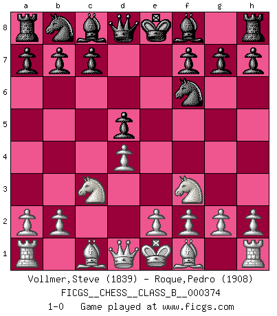 Last move : 1-0 2024 June 30 11:41:37 [Event "FICGS__CHESS__CLASS_B__000374"] [Site "FICGS"] [Date "2024.04.08"] [Round "1"] [White "Vollmer,Steve"] [Black "Roque,Pedro"] [Result "1-0"] [WhiteElo "1839"] [BlackElo "1908"] 1.d4 Nf6 2.c4 e6 3.Nf3 d5 4.cxd5 exd5 5.Nc3 1-0 This chess game has been lost on time (started : 2024.04.08 22:33:37) Follow this game move after move (download)During a Chess competition a Chessmaster should be a combination of a beast of prey and a monk. (Alexander Alekhine) Ich verachte Kasparow. (Viktor Kortschnoi) Un Peón pasado es un criminal, quién debe ser mantenido bajo candado y llave. Leves medidas, tales como vigilancia policiaca, no son suficientes. (Aaron Nimzovich) Ce qui caractérise les parties de combat, c'est que si le défenseur a constamment de difficiles problèmes à résoudre, l'attaquant doit chercher sans relâche de nouvelles possibilités d'attaque. (Koblentz) Gambling is the son of avarice and the father of despair. (French proverb)