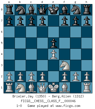 Last move : 1-0 2007 October 24 20:2:8 [Event "FICGS__CHESS__CLASS_F__000046"] [Site "FICGS"] [Date "2007.09.14"] [Round "1"] [White "Brieler,Jay"] [Black "Berg,Allen"] [Result "1-0"] [WhiteElo "1350"] [BlackElo "1312"] 1.e4 e5 2.Nf3 1-0 This chess game has been lost on time (started : 2007.09.14 14:57:54) King's knight Opening Player White won this chess game. Follow this game move after move (download)Chess is a cold bath for the mind. (Sir John Simon) Ein Isolani verdüstert die Stimmung auf dem ganzen Schachbrett. (Savielly Grigorievitsch Tartakower) Sin errores no puede haber brillantez. (Emanuel Lasker) Le temps de noter son nom sur la feuille de partie, j'étais déjà en zeitnot ! D'un modeste amateur apparié lors de la première ronde d'un open contre le grand-maître Azmaïparashvili. In God we trust, all others we virus scan. (Anonymous)