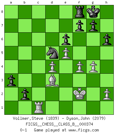 Last move : 0-1 2024 September 2 22:12:6 [Event "FICGS__CHESS__CLASS_B__000374"] [Site "FICGS"] [Date "2024.04.08"] [Round "1"] [White "Vollmer,Steve"] [Black "Dyson,John"] [Result "0-1"] [WhiteElo "1839"] [BlackElo "2079"] 1.d4 Nf6 2.c4 e6 3.Nf3 d5 4.Nc3 Bb4 5.Bg5 dxc4 6.Rc1 b5 7.e4 Nbd7 8.Qc2 h6 9.Bd2 Bxc3 10.bxc3 c5 11.Be2 Bb7 12.e5 Ne4 13.O-O Nxd2 14.Nxd2 cxd4 15.cxd4 O-O 16.Ne4 Bxe4 17.Qxe4 Nb6 18.Rfd1 Nd5 19.f4 Rc8 20.g4 Qa5 21.Qf3 Qxa2 22.Ra1 Qc2 23.Rac1 Qb3 24.Kf2 a5 25.Qxb3 cxb3 26.Bd3 Rxc1 27.Rxc1 a4 28.Bxb5 a3 29.Bd3 b2 0-1 Follow this game move after move (download)Fischer is under obligation to nobody. (Joseph Platz) Man gibt nur Pakete auf. (Paul Keres) No es una movida, aún la mejor movida que tu debas buscar, sino un plan comprensible. (Eugene Znosko-Borovsky) Mon pion favori sur ma case favorite ! Bronstein en parlant d'un coup de pion en h5 quand il avait les Noirs. The Internet is so big, so powerful and pointless that for some people it is a complete substitute for life. (Andrew Brown)