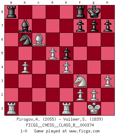 Last move : 1-0 2024 August 31 11:28:38 [Event "FICGS__CHESS__CLASS_B__000374"] [Site "FICGS"] [Date "2024.04.08"] [Round "1"] [White "Pirogov,Andrey Mikhaylovich"] [Black "Vollmer,Steve"] [Result "1-0"] [WhiteElo "2055"] [BlackElo "1839"] 1.e4 e5 2.Nf3 Nc6 3.Bb5 a6 4.Ba4 Nf6 5.O-O d6 6.Re1 b5 7.Bb3 Be7 8.c3 Na5 9.Bc2 c5 10.h3 Bb7 11.d4 Nc6 12.d5 Nb8 13.a4 Nbd7 14.Qe2 c4 15.Be3 O-O 16.Na3 Nc5 17.Bxc5 dxc5 18.axb5 axb5 19.Nxb5 Qb6 20.Qxc4 Bd6 21.Nxd6 Qxd6 22.b4 cxb4 23.Qxb4 Qxb4 24.cxb4 Nd7 25.Ba4 Nb6 26.Bc6 1-0 Follow this game move after move (download)Human affairs are like a Chess game: only those who do not take it seriously can be called good players. (Hung Tzu Ch'eng) Intelligenz läßt sich nicht am Weg, sondern nur am Ergebnis feststellen. (Garry Kasparov) Cada Peón es potencialmente una Reina. (James Mason) Tout change constamment, y compris dans le monde des Echecs. (Botvinnik) Thus, what is of supreme importance in war is to attack the enemy's strategy. (Sun Tzu)