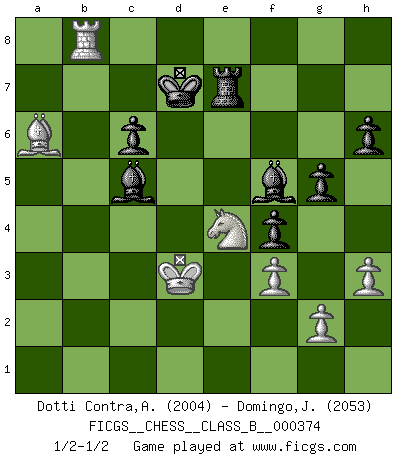Last move : 1/2-1/2 2024 September 16 0:22:26 [Event "FICGS__CHESS__CLASS_B__000374"] [Site "FICGS"] [Date "2024.04.08"] [Round "1"] [White "Dotti Contra,Alessandro"] [Black "Domingo,Jordi"] [Result "1/2-1/2"] [WhiteElo "2004"] [BlackElo "2053"] 1.e4 e5 2.Nf3 f5 3.d3 Nc6 4.Be2 fxe4 5.dxe4 Nf6 6.O-O Bc5 7.Nc3 O-O 8.Bc4+ Kh8 9.Be3 Bb4 10.Nd5 Be7 11.Nd2 Nb4 12.Nxf6 Bxf6 13.a3 Nc6 14.b4 d6 15.b5 Nd4 16.Nf3 Ne6 17.a4 Qe8 18.Qd2 Nf4 19.Bxf4 exf4 20.Rae1 a6 21.Qd5 Qg6 22.Kh1 Bc3 23.Rb1 axb5 24.axb5 Qf6 25.Rb3 Ra4 26.h3 g6 27.Qd3 Ba5 28.Bd5 Bb6 29.Ra3 Rxa3 30.Qxa3 Kg7 31.Kg1 Bc5 32.Qa5 Bb6 33.Qa3 Bc5 34.Qd3 Re8 35.Re1 Bb4 36.Rb1 Bc5 37.Qc4 Bb6 38.Qa2 g5 39.Qb2 Qxb2 40.Rxb2 Kf6 41.Kf1 h6 42.Rb4 Bc5 43.Rb1 Ke7 44.Ke2 Kd7 45.Nd2 Re7 46.Ra1 c6 47.bxc6+ bxc6 48.Bc4 Kc7 49.Ba6 Bd7 50.Rb1 d5 51.f3 Bb6 52.c4 dxe4 53.Nxe4 Bf5 54.c5 Bxc5 55.Rb7+ Kd8 56.Rb8+ Kd7 57.Kd3 1/2-1/2 Follow this game move after move (download)Chess books should be used as we use glasses: to assist the sight, although some players make use of them as if they thought they conferred sight. (Jose Raul Capablanca) Alles was am Schachbrett zählt sind gute Züge. (Robert James Fischer) Botvinnik trató de alejar el misterio referente al Ajedrez, siempre relacionandolo a situaciones de la vida diaria. Solía llamar al Ajedrez un problema inexacto típico, similar a aquellos en que la gente tiene siempre que resolver a cada día. (Garry Kasparov) Les Echecs sont et restent toujours un combat, un combat intégral comme la boxe, la lutte ou un autre sport, et où il doit y avoir un vainqueur et un vaincu. (Joseph Emil Diemer) The production of too many useful things results in too many useless people. (Karl Marx)