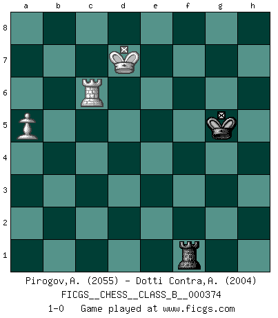 Last move : 1-0 2024 November 8 21:48:57 [Event "FICGS__CHESS__CLASS_B__000374"] [Site "FICGS"] [Date "2024.04.08"] [Round "1"] [White "Pirogov,Andrey Mikhaylovich"] [Black "Dotti Contra,Alessandro"] [Result "1-0"] [WhiteElo "2055"] [BlackElo "2004"] 1.e4 e5 2.Nf3 Nc6 3.Bb5 Nf6 4.d3 d6 5.O-O Bd7 6.Re1 Be7 7.c3 O-O 8.Ba4 a6 9.h3 h6 10.d4 exd4 11.cxd4 d5 12.e5 Ne4 13.Nc3 Bf5 14.Bc2 Nxc3 15.bxc3 Qd7 16.Nh2 Bxc2 17.Qxc2 b5 18.Bd2 Na5 19.Ng4 Qc6 20.e6 Nc4 21.exf7+ Rxf7 22.Re2 Nxd2 23.Ne5 Qe6 24.Qxd2 R7f8 25.Rf1 Bd6 26.f4 Rae8 27.g4 Re7 28.R1f2 Bxe5 29.Rxe5 Qd6 30.Qe3 Rfe8 31.Re2 Rxe5 32.dxe5 Qe7 33.f5 a5 34.Qa7 a4 35.e6 Rc8 36.Kg2 Rd8 37.Rf2 Rf8 38.Qd4 c6 39.Qe5 Kh7 40.Kg3 Kg8 41.Rf3 a3 42.h4 c5 43.Qxd5 b4 44.cxb4 cxb4 45.Rd3 Rc8 46.Kh3 Kf8 47.Qd7 Qxd7 48.exd7 Rd8 49.g5 hxg5 50.hxg5 g6 51.fxg6 Kg7 52.Kg4 b3 53.Rxb3 Rxd7 54.Rxa3 Rd1 55.Ra7+ Kxg6 56.Ra6+ Kg7 57.a4 Ra1 58.a5 Rg1+ 59.Kf5 Rf1+ 60.Ke6 Kg6 61.Kd7 Kxg5 62.Rc6 1-0 Follow this game move after move (download)There are tough players and nice guys, and I'm a tough player. (Bobby Fischer) Nicht daß Diemer aus Opportunismus Mitglied der NSDAP geworden wäre. Er war ein Fanatiker, in allem, was er tat. (Hans Ree) El Ajedrez es un invernadero donde los frutos del carácter pueden madurar mas completamente que en la vida. (Edward Morgan Foster) Les échecs, c'est la lutte contre l'erreur. (Johannes Zukertort) I couldn't make any sense out of what this particular thread is about. It sounds like R2 D2 computer speaking. A space fight ?!? Some 'command' problems in Moscow ? Some killers & narcotic addicts attacking some game & a god wannabe ?? (Dinesh De Silva, lost in a russian conflict in FICGS forum)