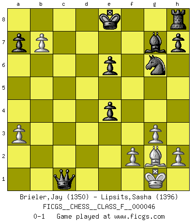 Last move : 0-1 2007 October 13 19:48:14 [Event "FICGS__CHESS__CLASS_F__000046"] [Site "FICGS"] [Date "2007.09.14"] [Round "1"] [White "Brieler,Jay"] [Black "Lipsits,Sasha"] [Result "0-1"] [WhiteElo "1350"] [BlackElo "1396"] 1.e4 e6 2.d4 d5 3.e5 c5 4.c3 Nc6 5.Nf3 Bd7 6.g3 Qb6 7.Bg2 cxd4 8.cxd4 Nge7 9.O-O Nf5 10.Nc3 Nfxd4 11.a3 Nxf3+ 12.Qxf3 Nxe5 13.Qh5 Ng6 14.Be3 d4 15.Bxd4 Qxd4 16.Rac1 Qb6 17.b4 Be7 18.Rfd1 Rd8 19.Qf3 Bc6 20.Ne4 f5 21.Rxd8+ Qxd8 22.Qc3 fxe4 23.Qxg7 Bf6 24.b5 Bxg7 25.bxc6 Qd2 26.cxb7 Qxc1+ 0-1 French : Advance, Euwe variation Kingside Castling by player White (move 9) Player Black won this chess game. Follow this game move after move (download)All my games are real. (Bobby Fischer) Wenn ich Weiß habe gewinne ich weil ich Weiß habe, wenn ich Schwarz habe gewinne ich weil ich Bogoljubov bin. (Efim Bogoljubov) Yo no le temo a Spassky. Todos saben que yo soy el mejor. Uno no necesita un torneo para probarlo. (Bobby Fischer) Les échecs, c'est l'art d'analyser. (Mikhail Botvinnik) The leaves of memory seemed to make a mournful rustling in the dark. (Henry Wadsworth Longfellow)
